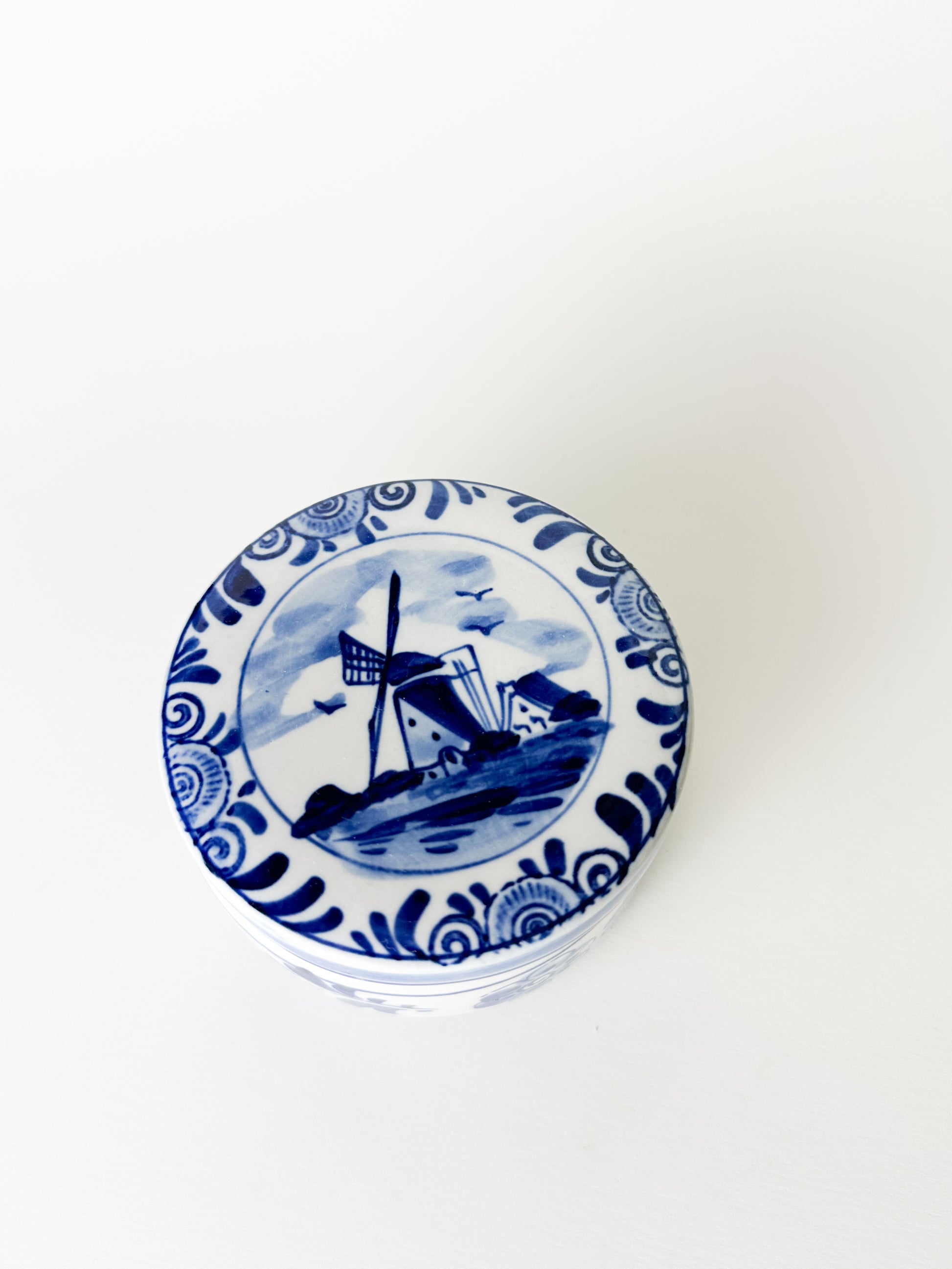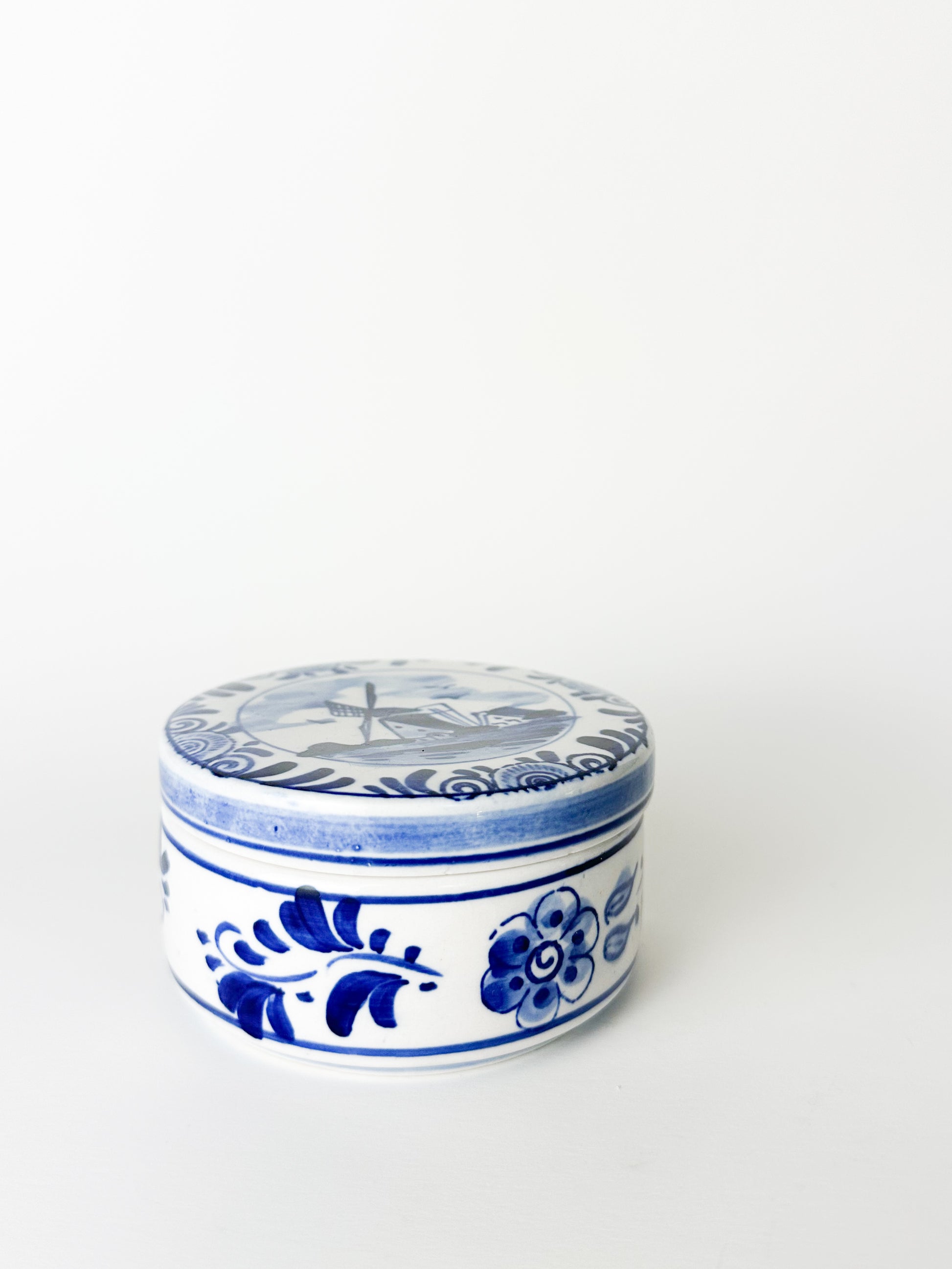 This round, lidded ceramic trinket box features a hand-painted Delft Blue windmill scene, rendered in rich cobalt tones against a soft white ground. The detailed landscape — complete with sweeping skies, water, and a traditional Dutch windmill — reflects the timeless charm and storytelling quality that Delftware is known for.