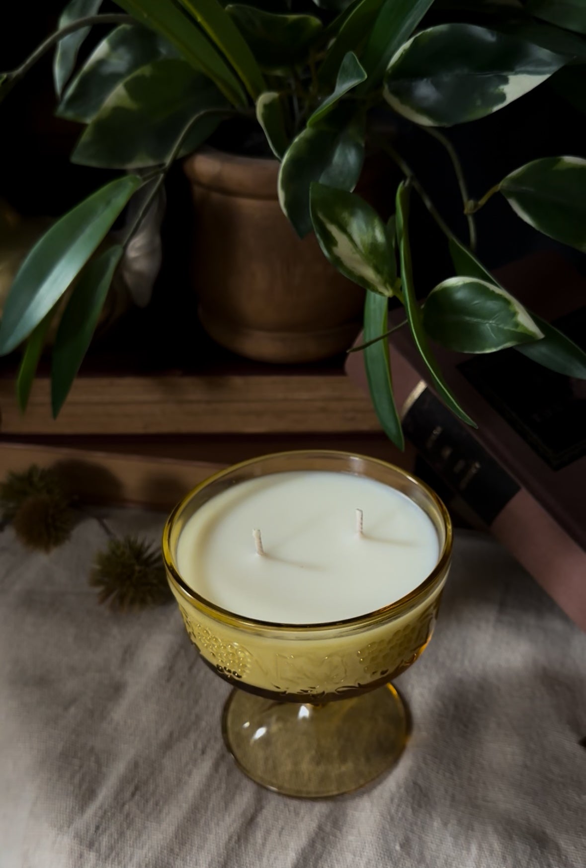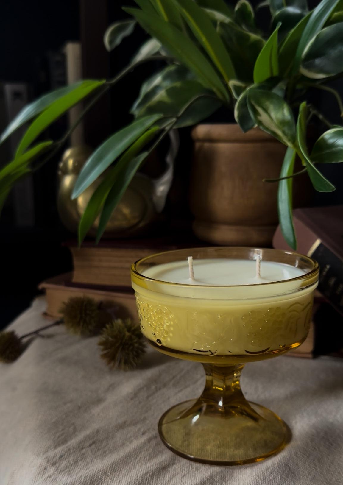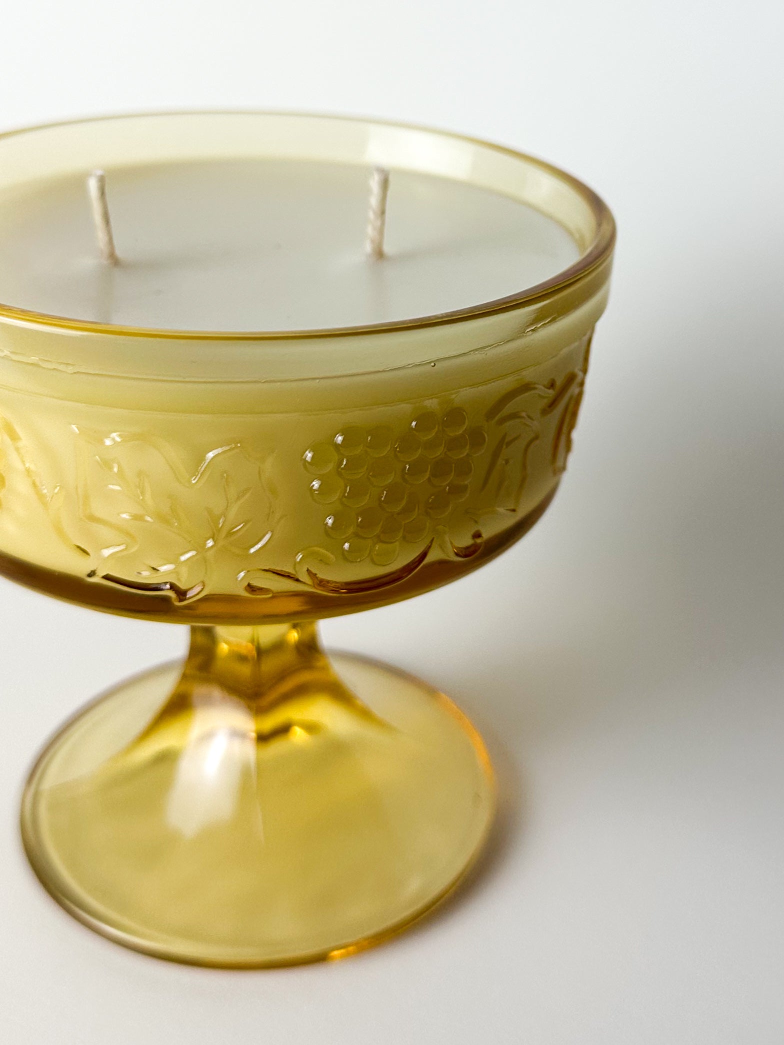 Originally crafted to hold a delicate scoop of sherbet or a sweet dessert, this vessel has been lovingly repurposed into a candle — giving it a new chapter while preserving its vintage charm. Its thick amber glass glows beautifully when lit, creating a cozy radiance reminiscent of candlelit dinners from decades past.
