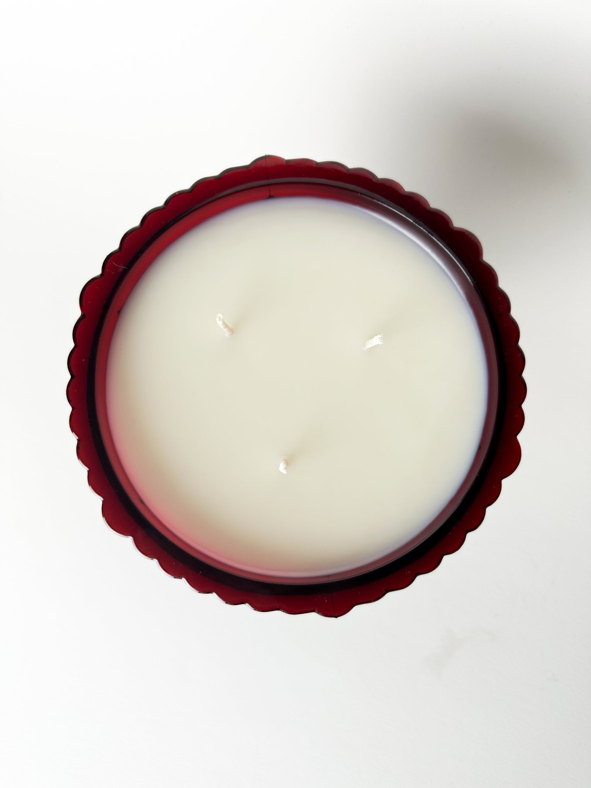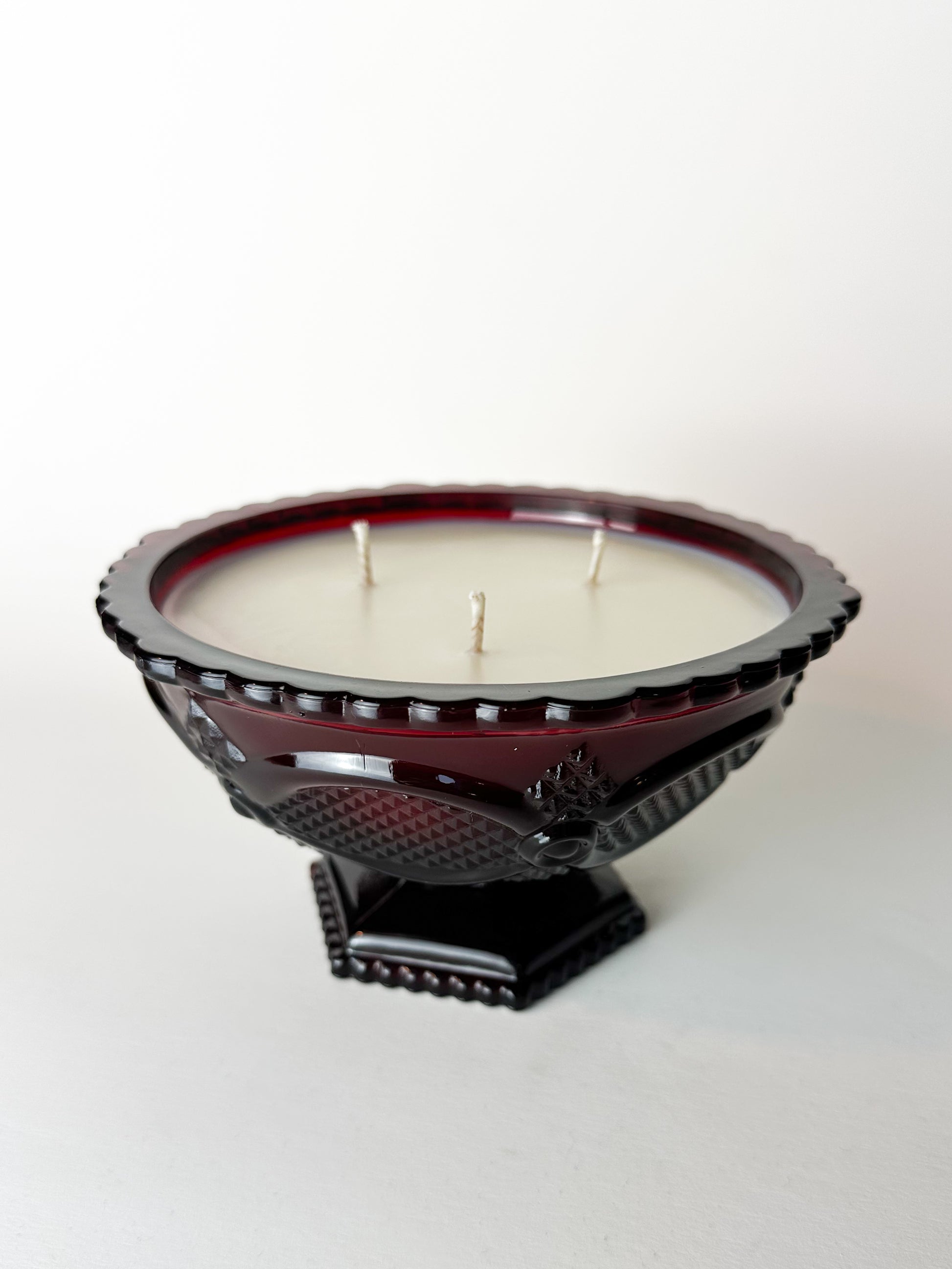Now thoughtfully repurposed, this candy dish has been transformed into a triple-wicked candle, filled with 11.62 oz of natural soy wax. When lit, the flame glows through the ruby glass, intensifying its depth and warmth. Once the candle has burned through, the vessel can enjoy a continued second life as a candy dish, catchall, or decorative centerpiece — extending its story beyond the flame.