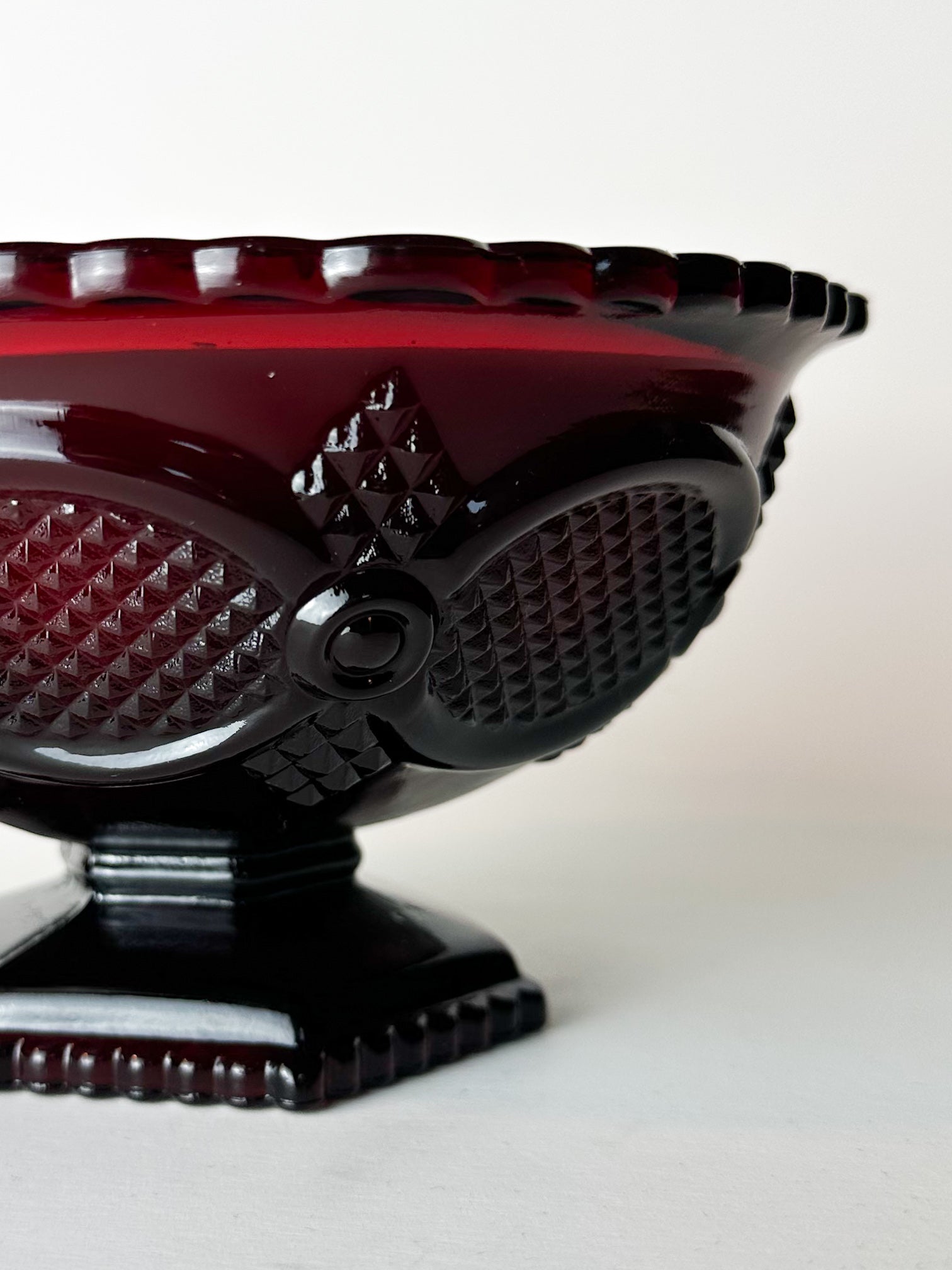 The dish features Avon’s signature ruby red glass — a dramatic, luminous tone reminiscent of historic cranberry glass. The geometric relief pattern and scalloped edges reflect traditional pressed glass techniques, where texture and light interplay created visual richness without excessive ornamentation. Originally intended for serving sweets or as a decorative tabletop accent, pieces like this often became cherished display objects within the home.