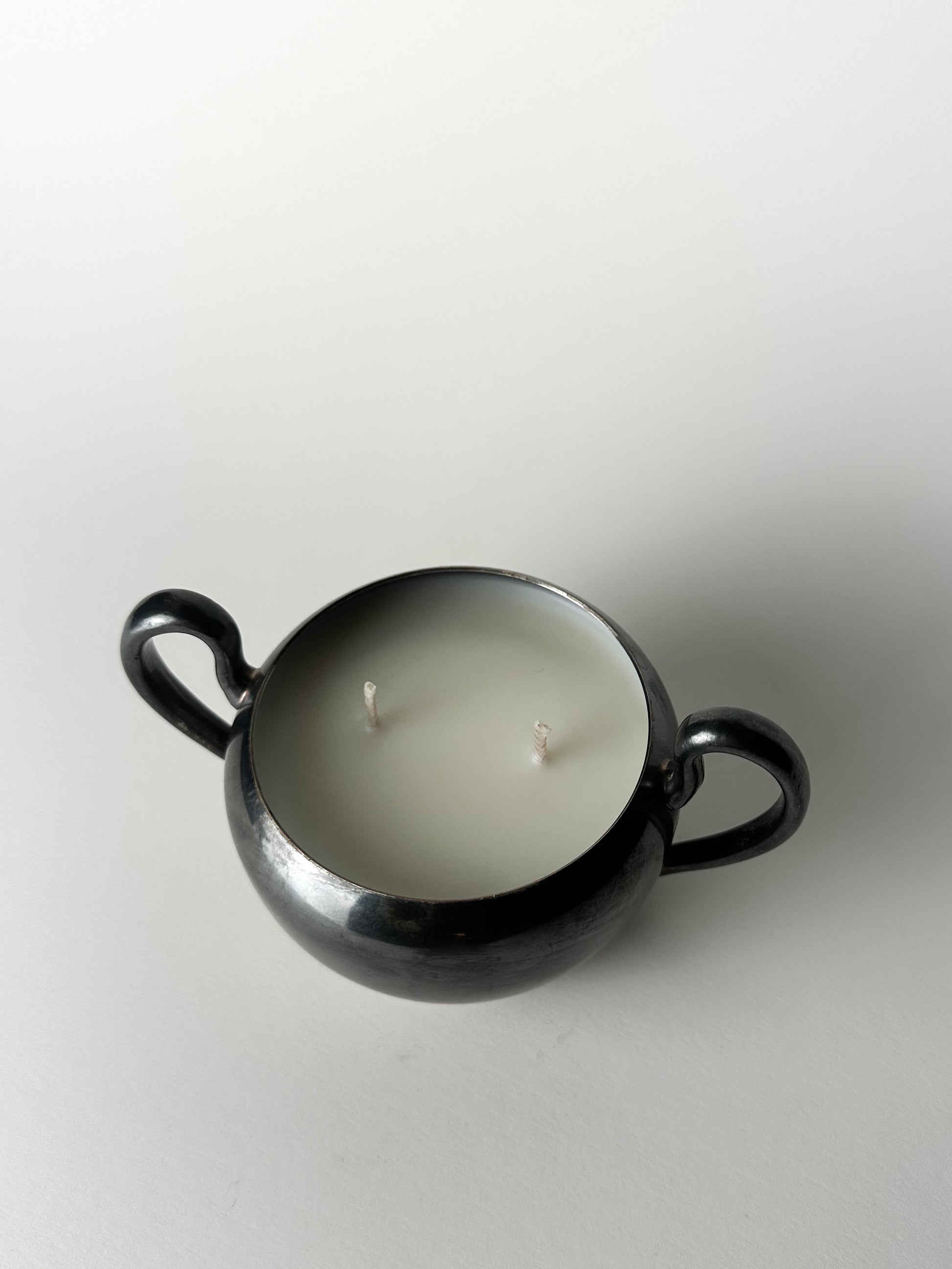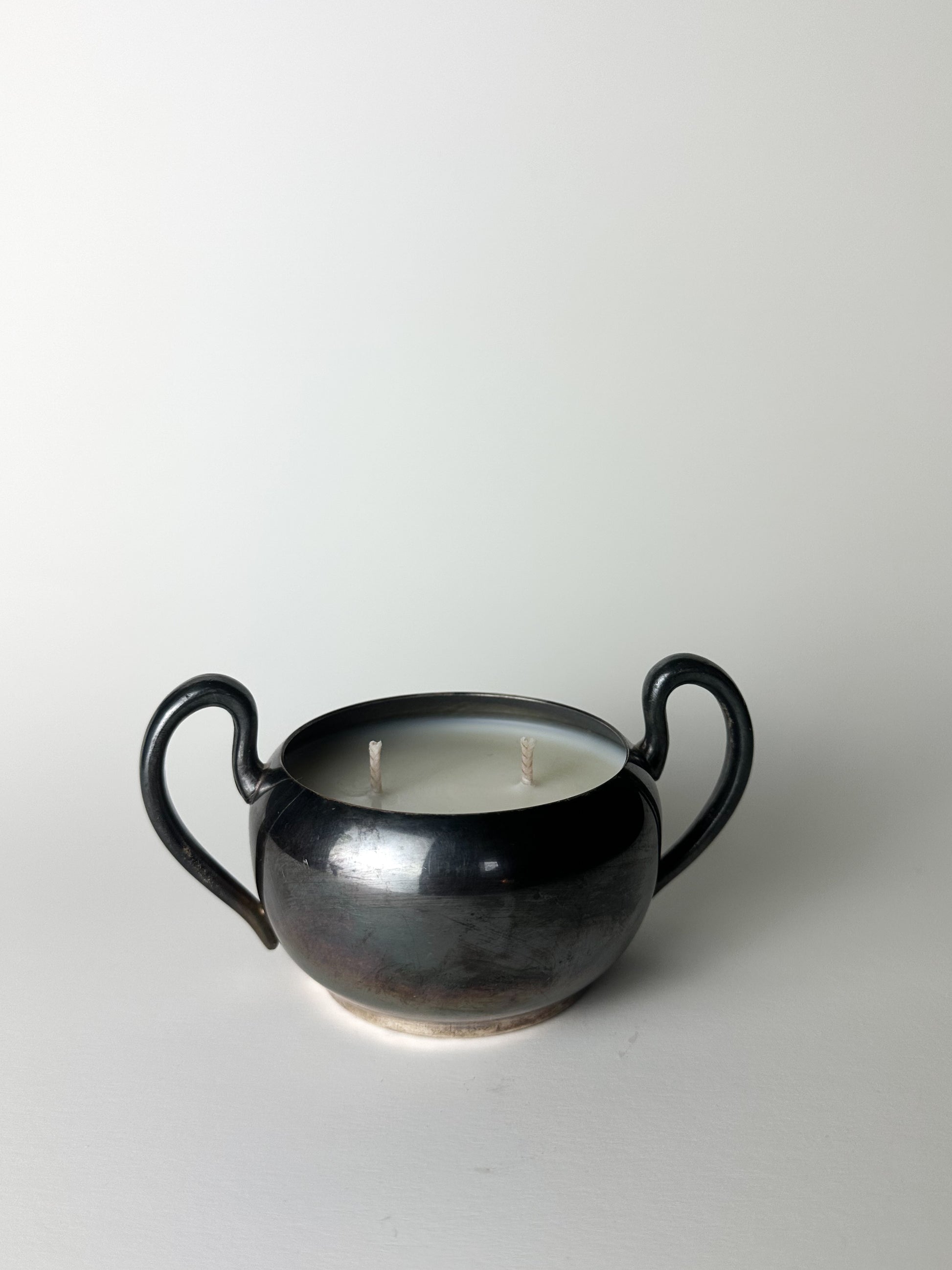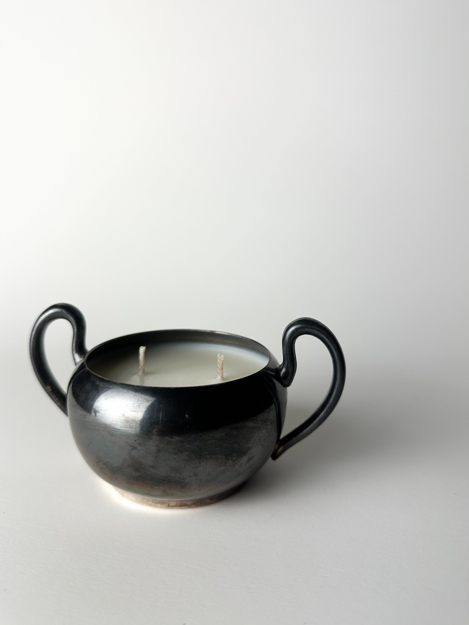 Now hand-poured with 6 oz of all-natural soy wax and double wicked for an even, luminous burn, this vessel’s new life celebrates its history rather than conceals it. Its softly weathered surface, curved handles, and delicate detailing make it a soulful addition to any space — one that bridges past and present with quiet charm.