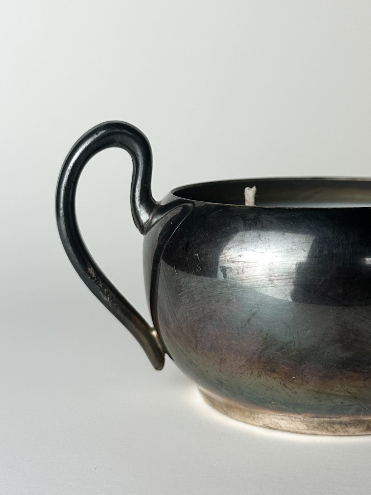 This vintage silver-plated sugar bowl, gracefully aged with a natural patina, carries the quiet beauty of time and use. Once a staple of elegant table settings, silver vessels like this were cherished pieces in early- to mid-20th-century homes — a symbol of hospitality and refinement. Over the years, as polished shine gave way to soft tarnish and warm wear, they’ve taken on a new kind of beauty — one that tells a story of shared meals and family gatherings.