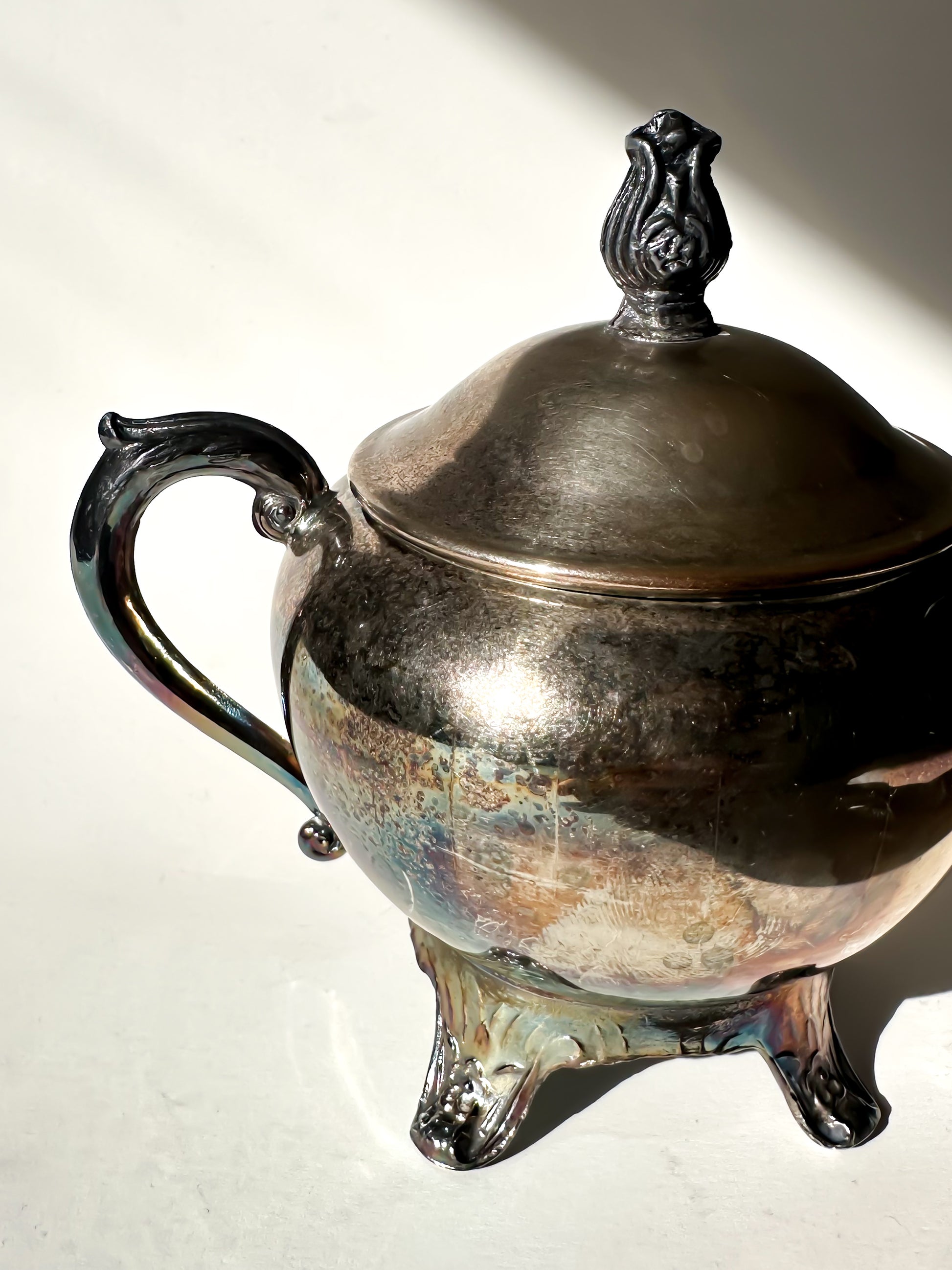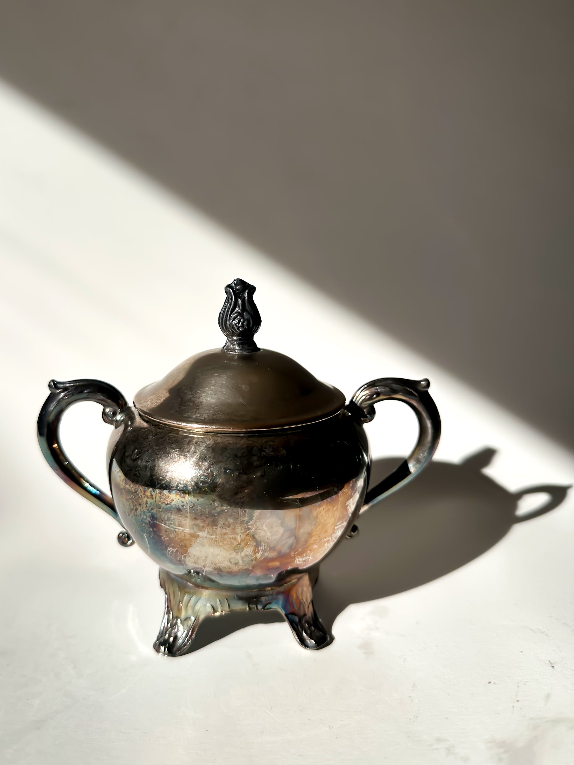 Originally part of a traditional tea service, sugar bowls like this were designed to accompany moments of gathering — placed at the center of the table, passed between hands, and used daily yet beautifully. The reflective silver surface was meant to catch candlelight and movement, adding warmth and refinement to even the simplest settings.