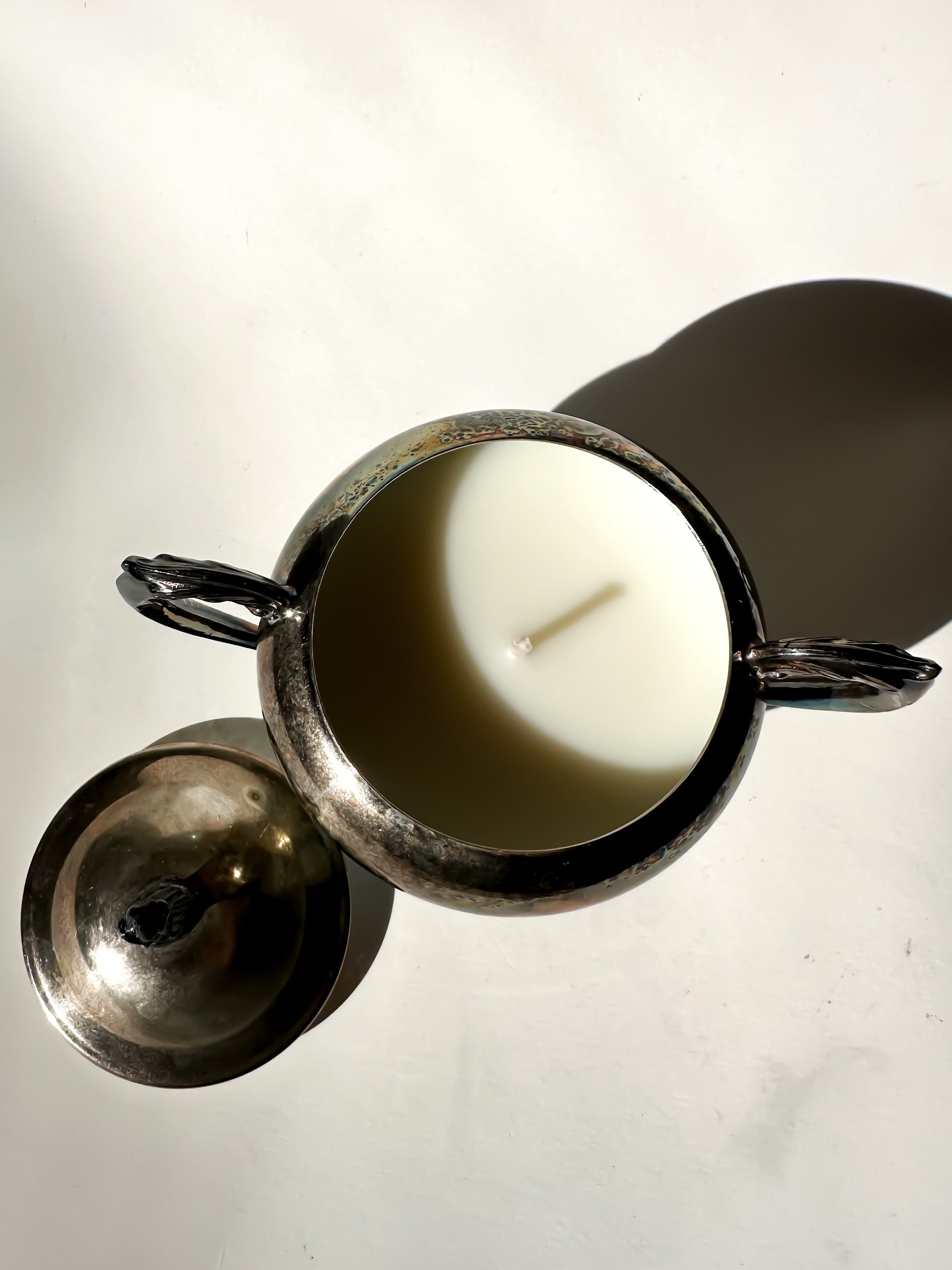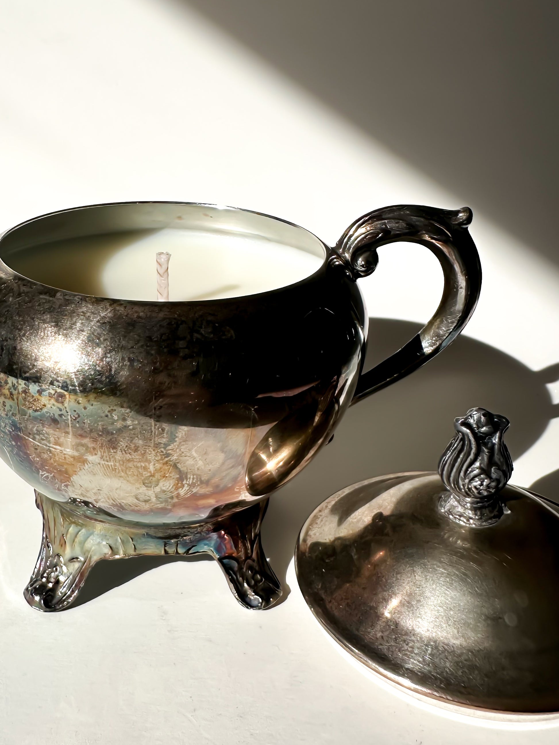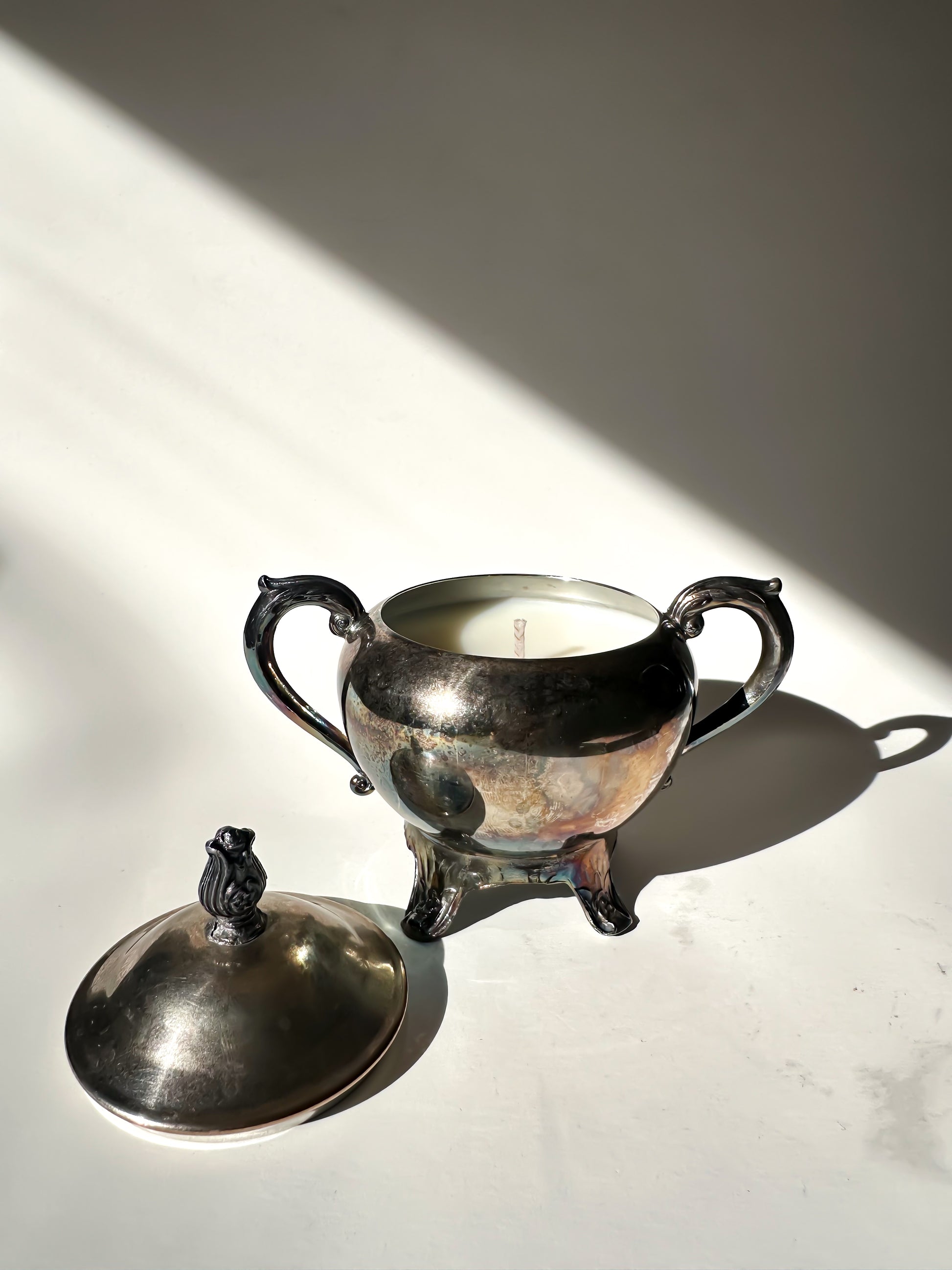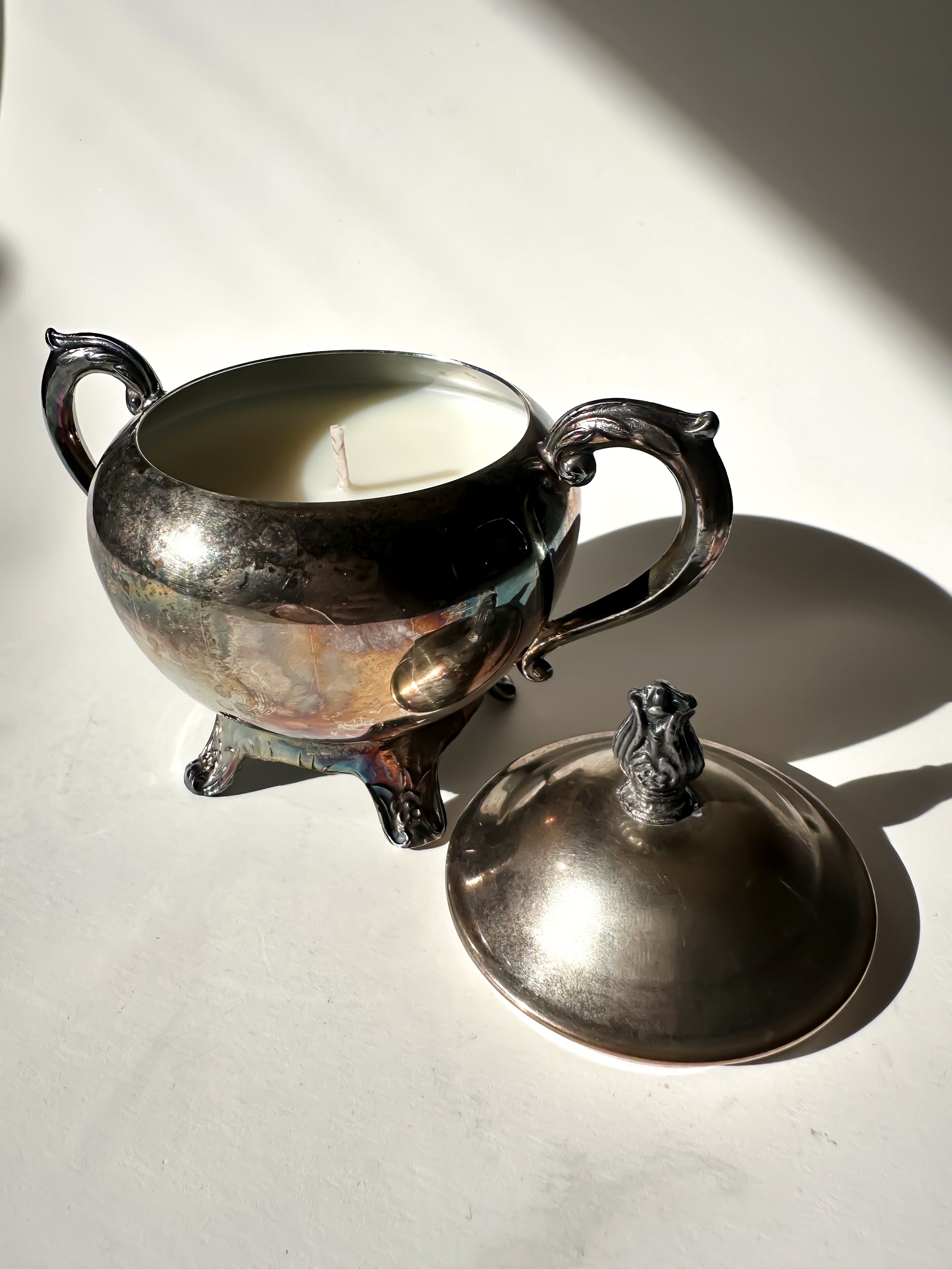 Now thoughtfully repurposed, this piece has been transformed into a hand-poured candle, filled with 5.19 oz of natural soy wax. When lit, the flame reflects softly across the silver-plated surface, highlighting its curves and subtle patina. The lid can be removed while burning and replaced afterward, preserving its original silhouette. Once finished, the vessel can be cleaned and reused as a keepsake box, small serving piece, or decorative accent — continuing its life beyond the flame.