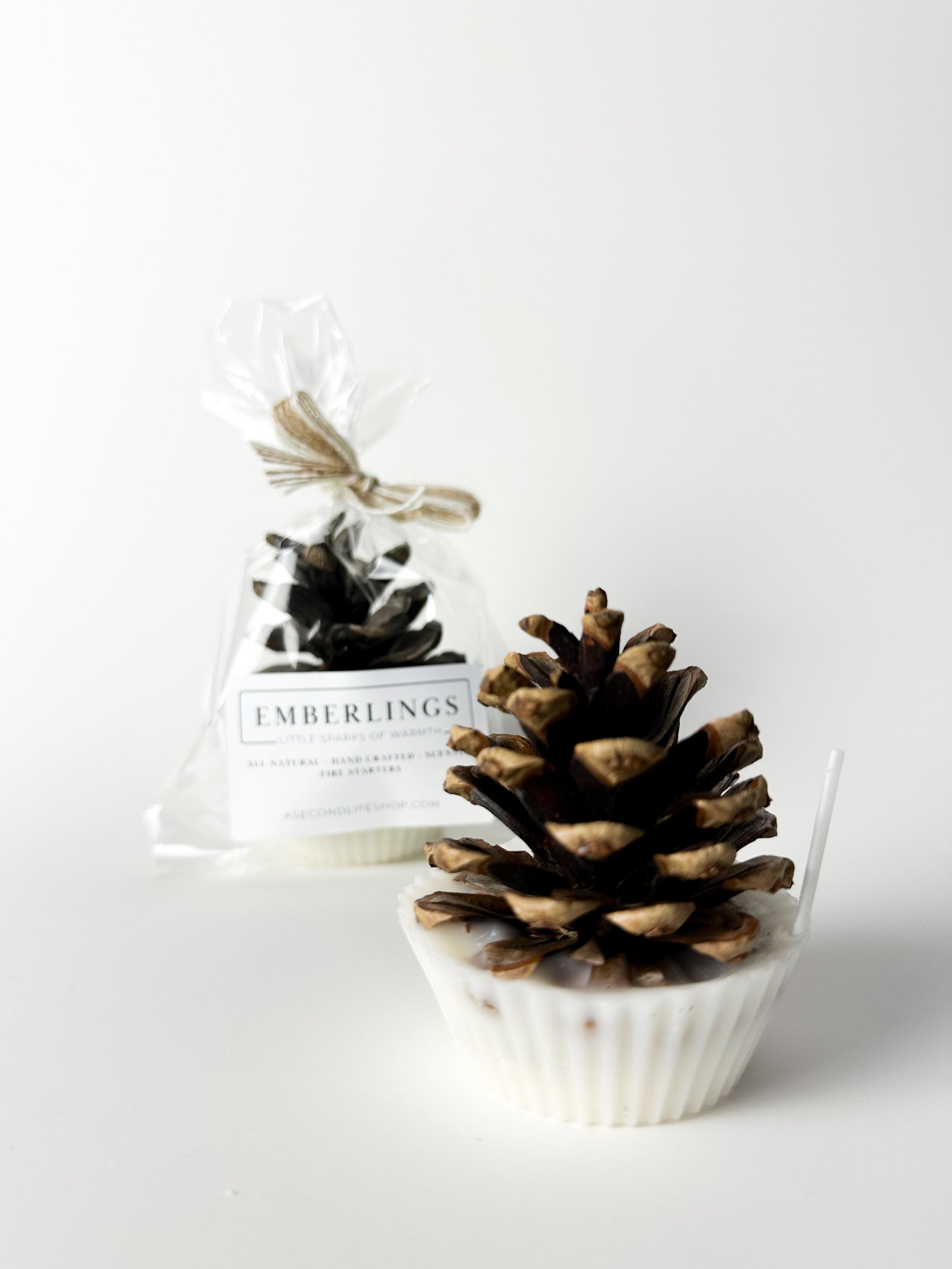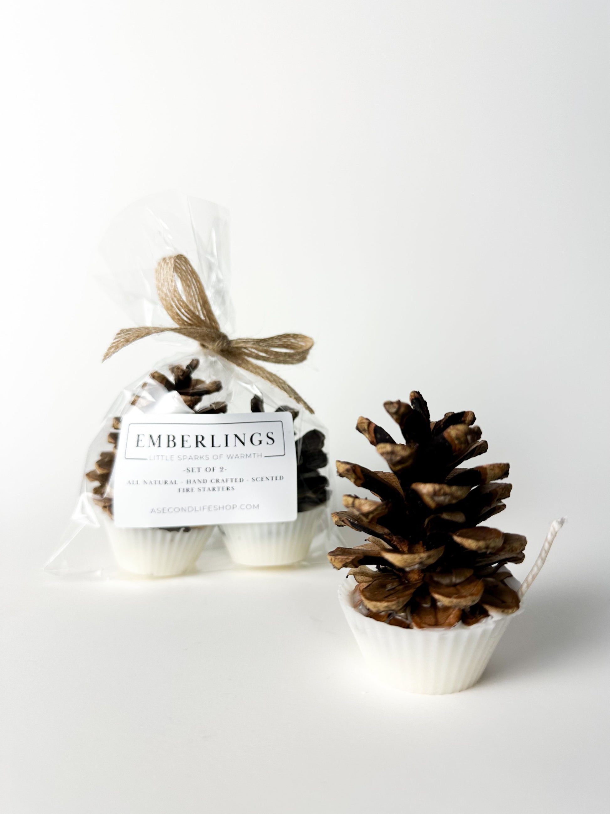 Handcrafted from real pinecones, each Emberling is a small spark of comfort — designed to kindle fires beautifully and naturally. Dipped in all-natural soy wax and infused with the scent of Fraser Fir, these pinecone fire starters bring the quiet calm of evergreen woods into every cozy moment.
