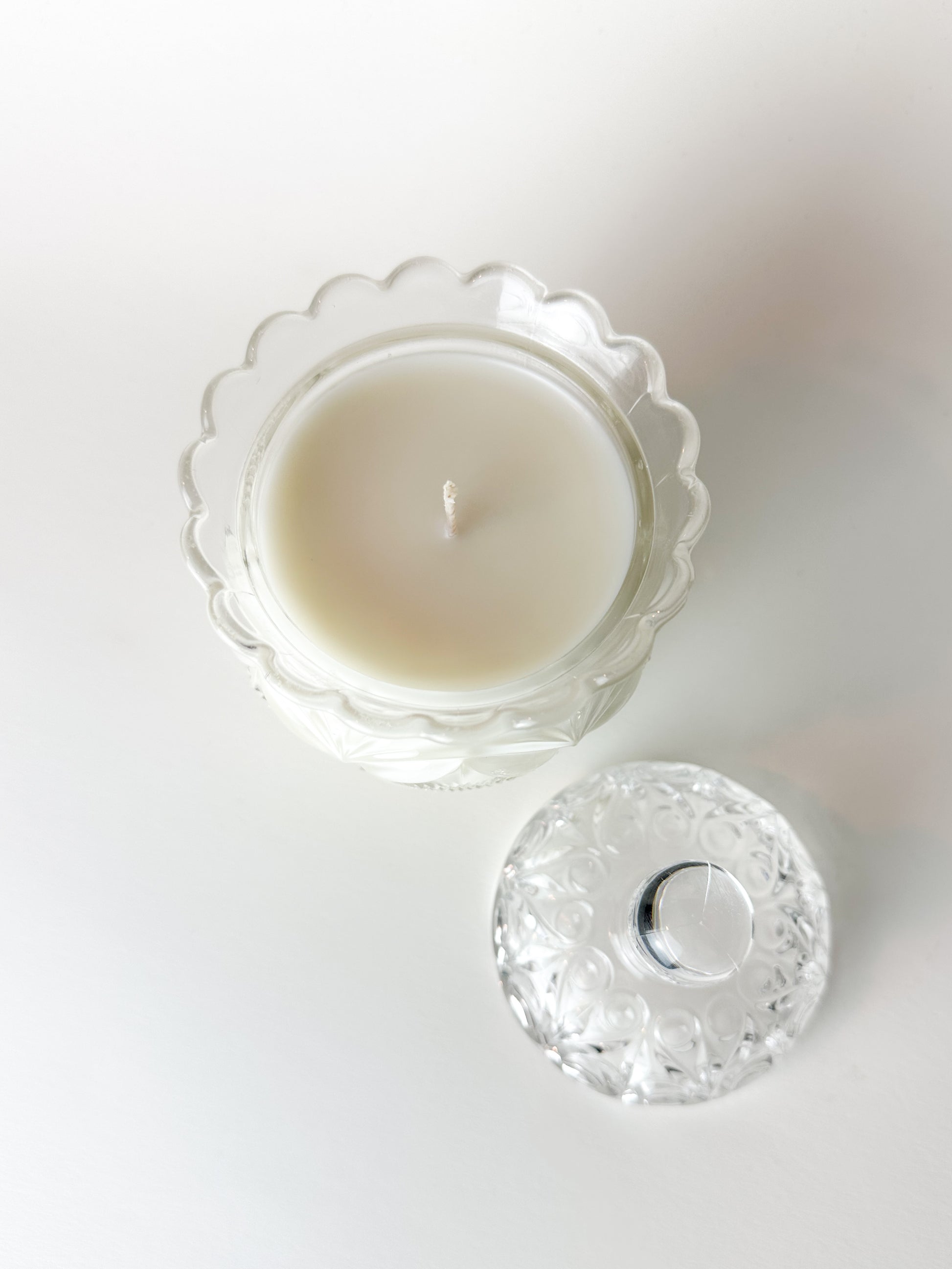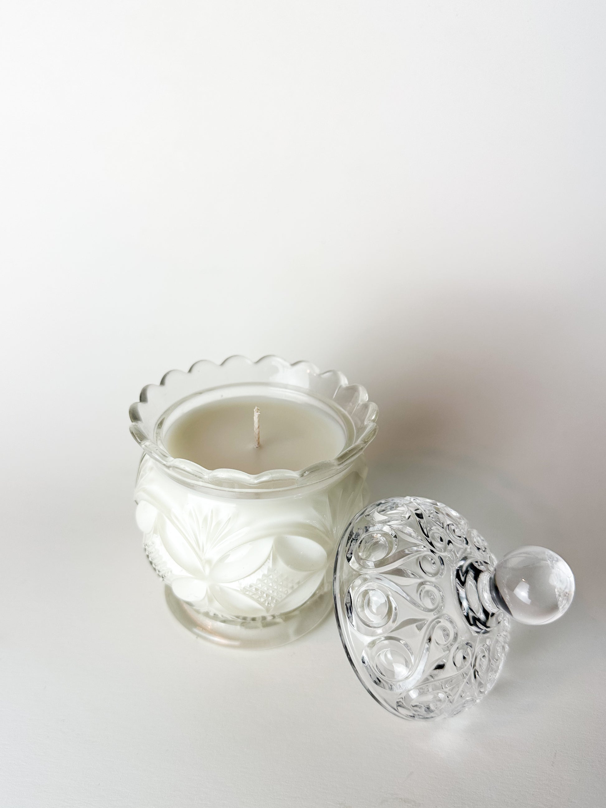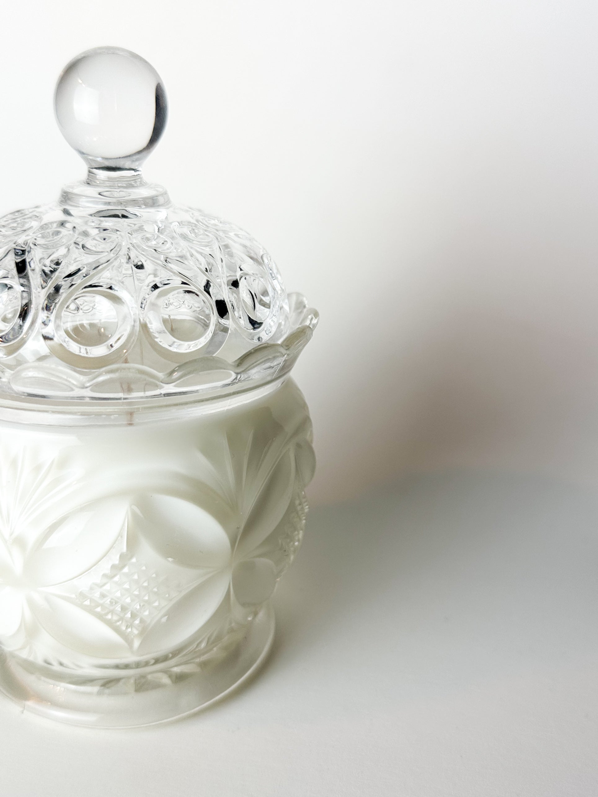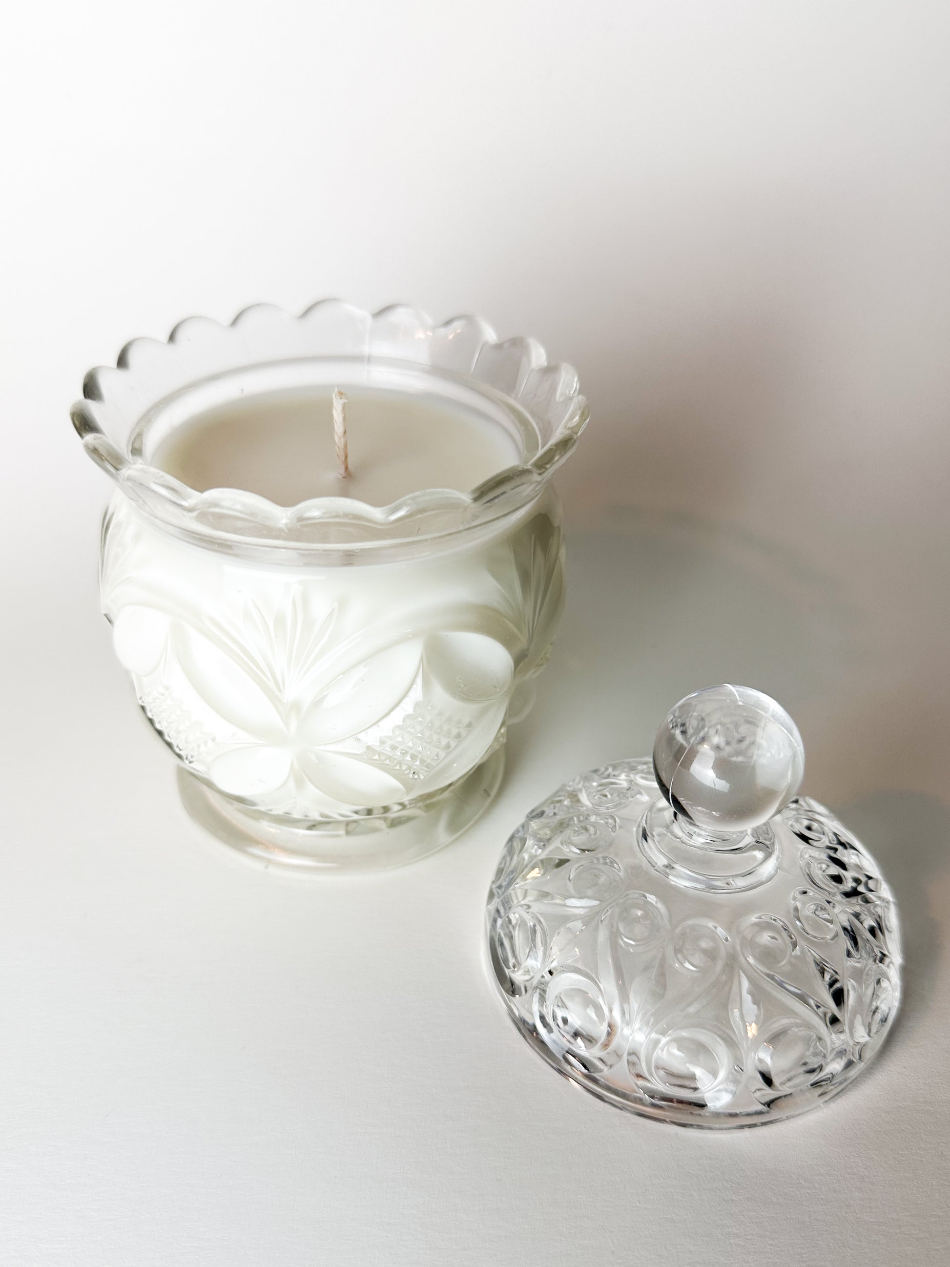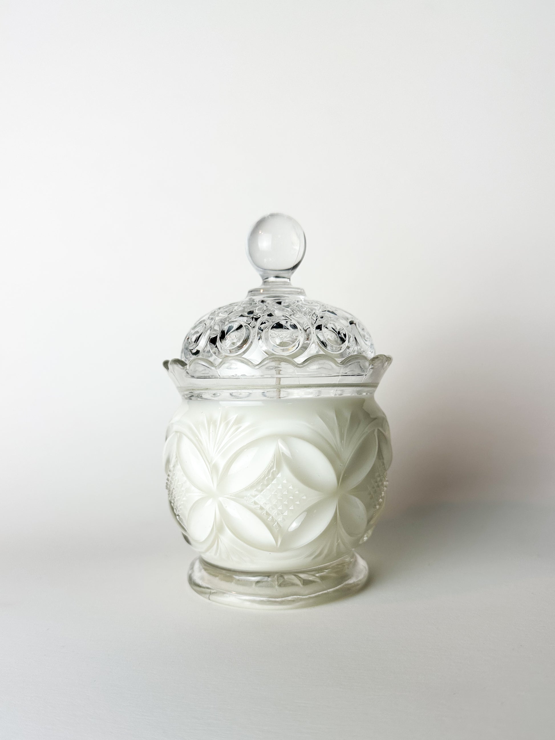Now thoughtfully repurposed, this antique sugar jar has been transformed into a candle, blending historic American glass artistry with modern ritual. When lit, the flame glows softly through the patterned glass, accentuating its intricate detailing. Once the candle has burned through, the vessel can enjoy a continued second life as a vanity jar, trinket holder, or decorative keepsake.