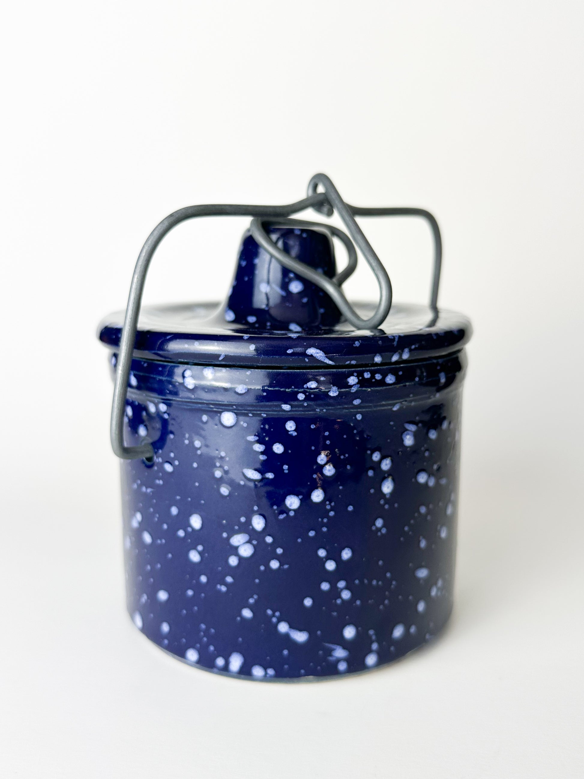 The wire bail lid closure is a defining detail, designed to keep contents secure while remaining easy to open and reuse. Over time, these crocks became staples in farmhouse kitchens and pantries, valued not only for function but for their simple, honest beauty. The speckled glaze, once purely practical, has since become iconic and highly collectible.