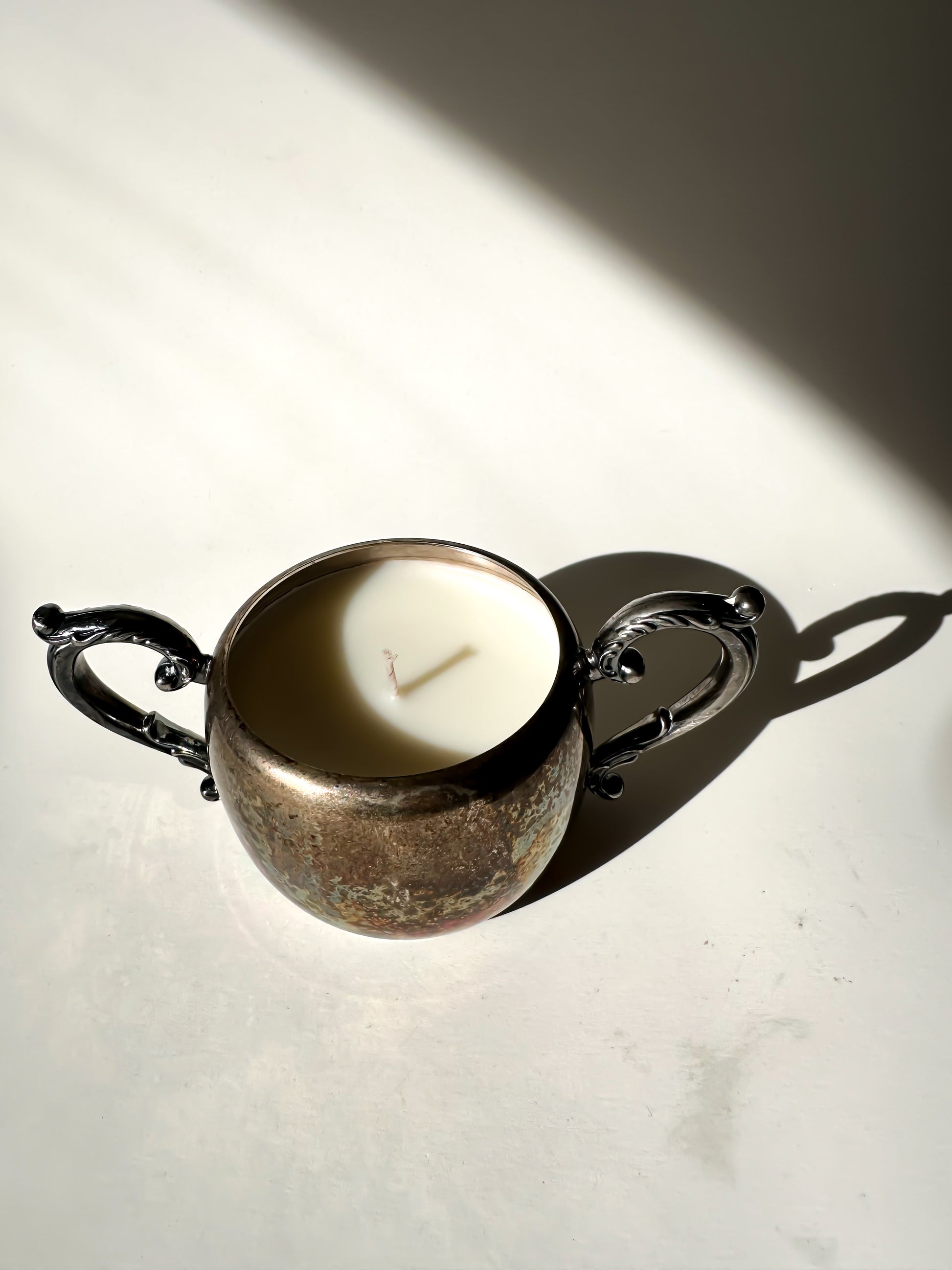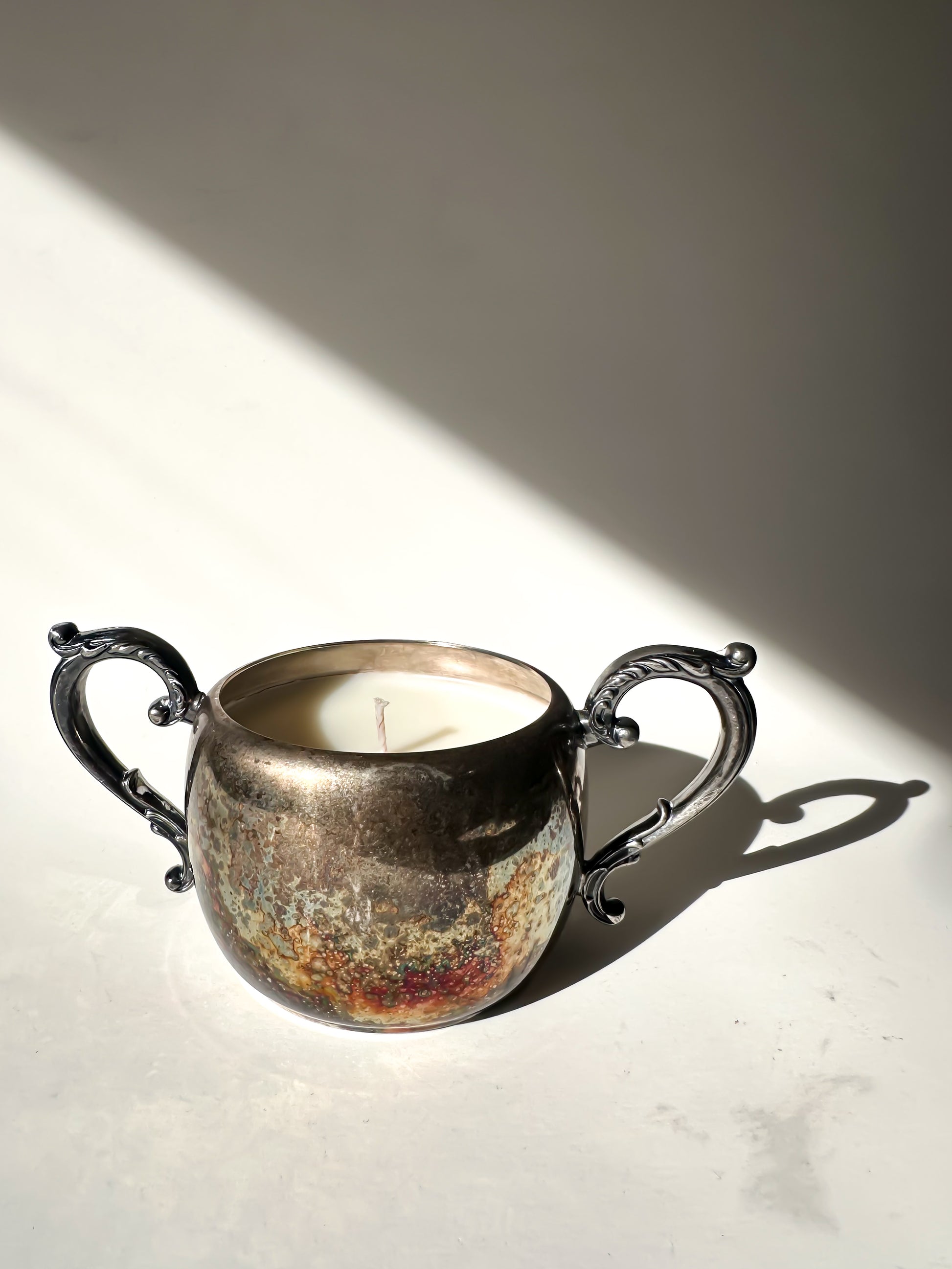 Now thoughtfully repurposed, this vessel has been transformed into a hand-poured candle, filled with 6.6 oz of natural soy wax. When lit, the flame reflects softly across the silver surface, enhancing its warmth and highlighting the organic variations in the patina. Once the candle has finished burning, the bowl can be cleaned and reused as a decorative catchall, small serving piece, or keepsake — continuing its life beyond the flame.