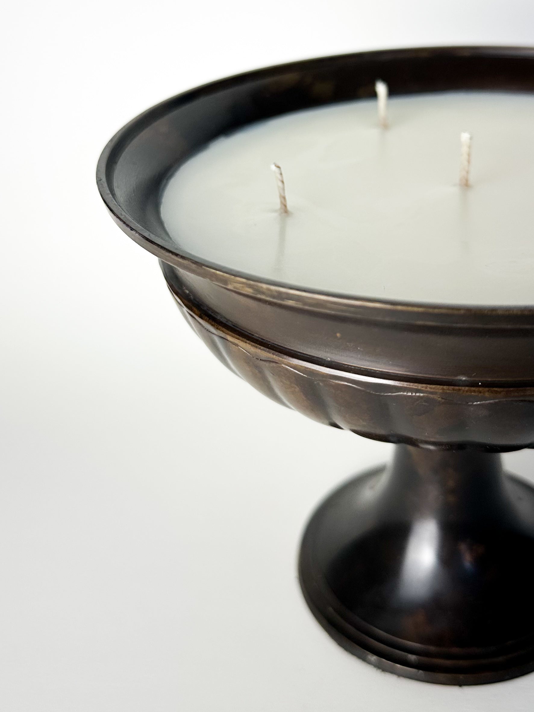 Originally crafted as a compote or ceremonial centerpiece, this vessel would have held fruit, flowers, or decorative arrangements — gracing dining tables, sideboards, and celebratory gatherings. Today, it has been thoughtfully repurposed into a candle, granting it a new purpose while preserving its history and charm. When lit, the aged brass reflects a soft, ambient glow, evocative of candlelit evenings from decades past.