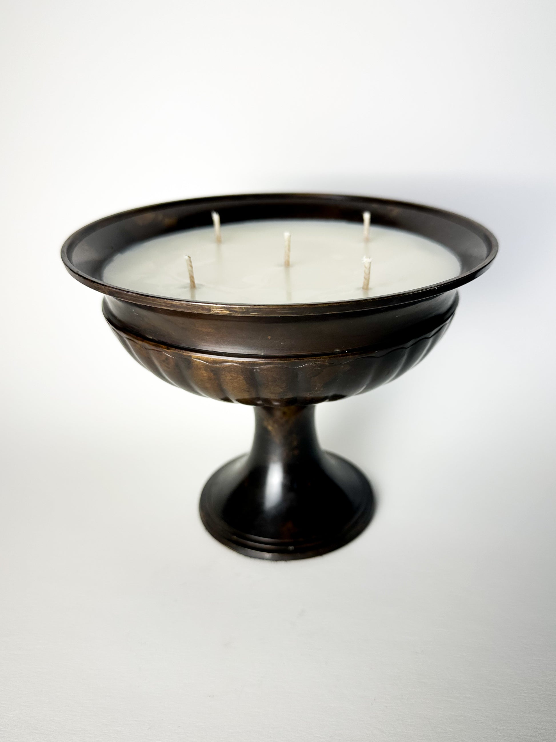 Now given a second life, this beautiful vessel holds 16 oz of wax and is five-wicked for a wide, radiant burn — transforming its original purpose into something both functional and atmospheric.