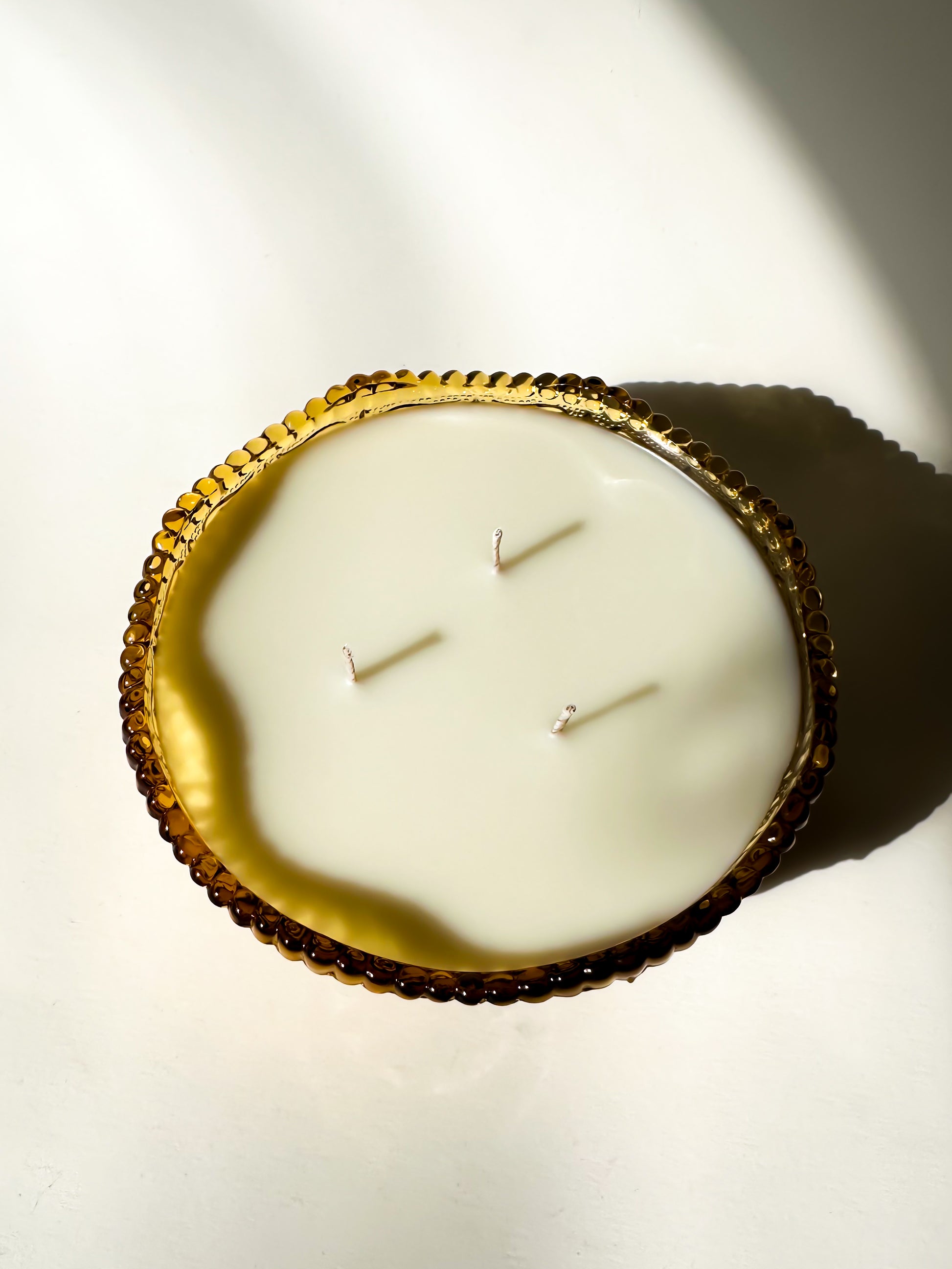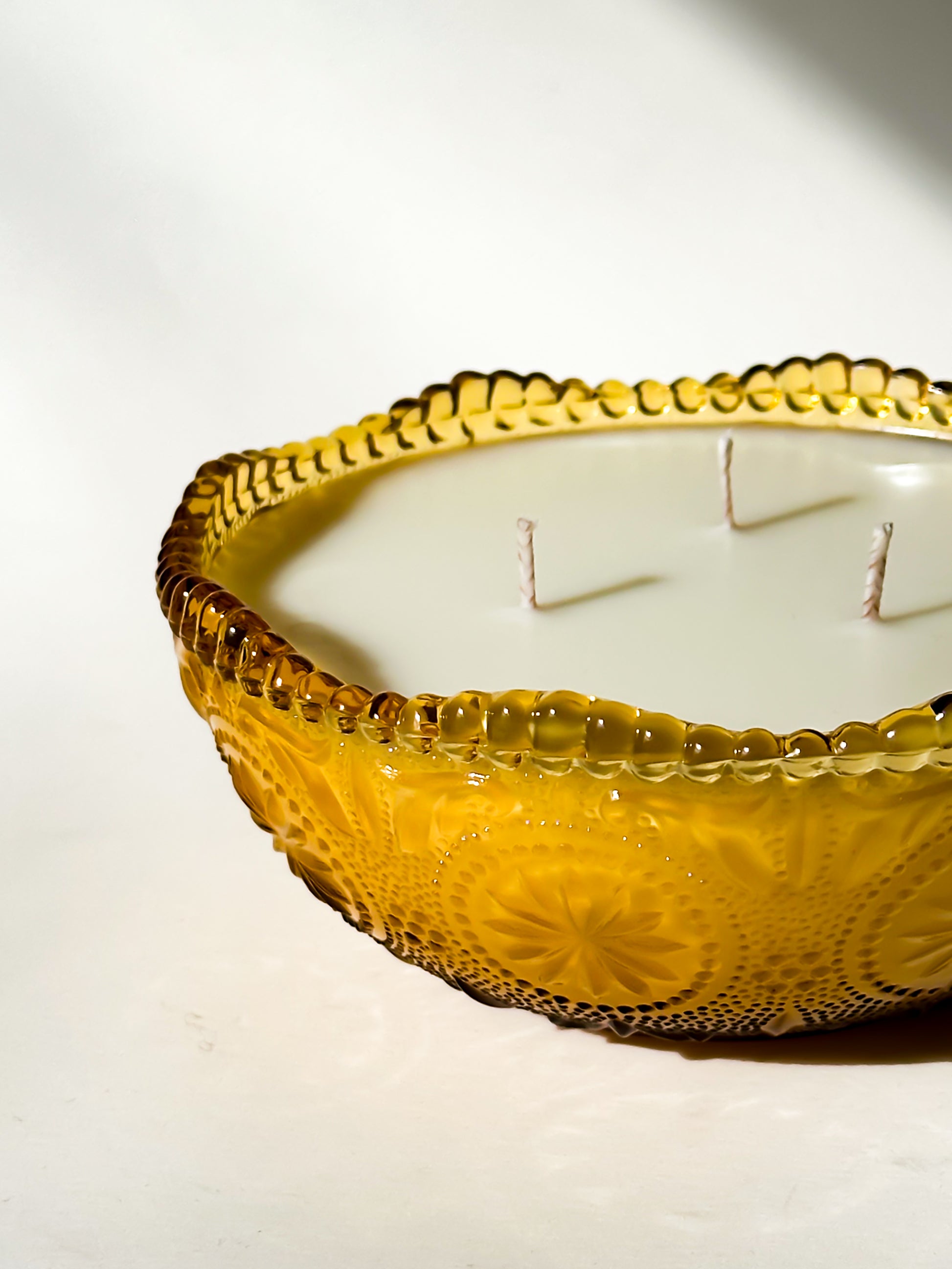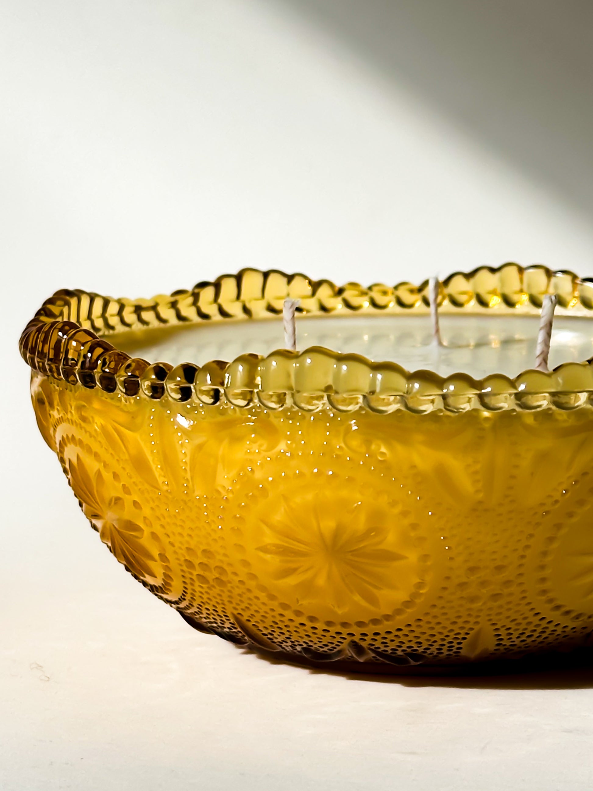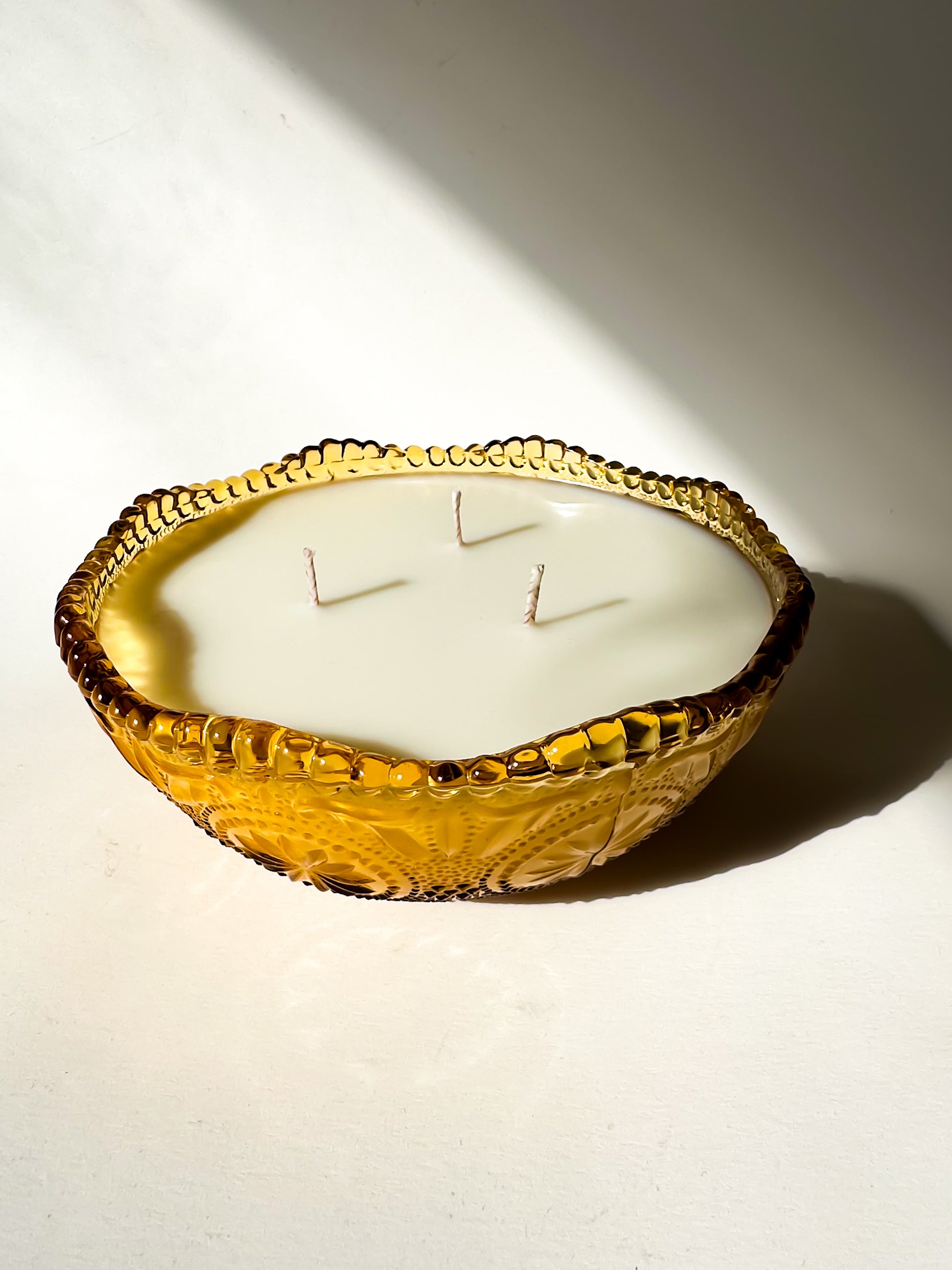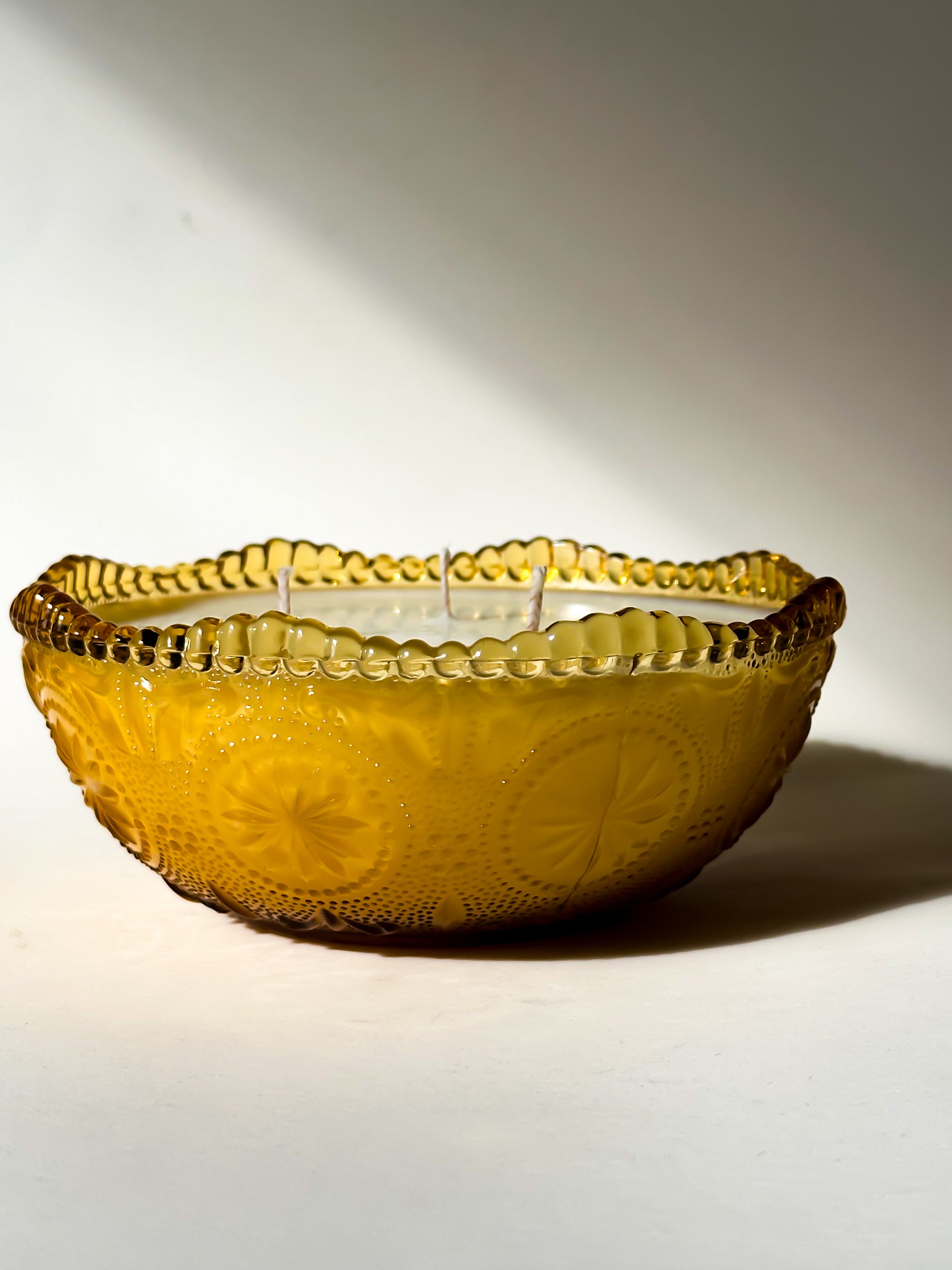 Originally intended as a serving or candy bowl, this vessel has been thoughtfully repurposed into a candle. When lit, the textured pattern catches and amplifies the flame, casting a soft, radiant glow through the amber glass.