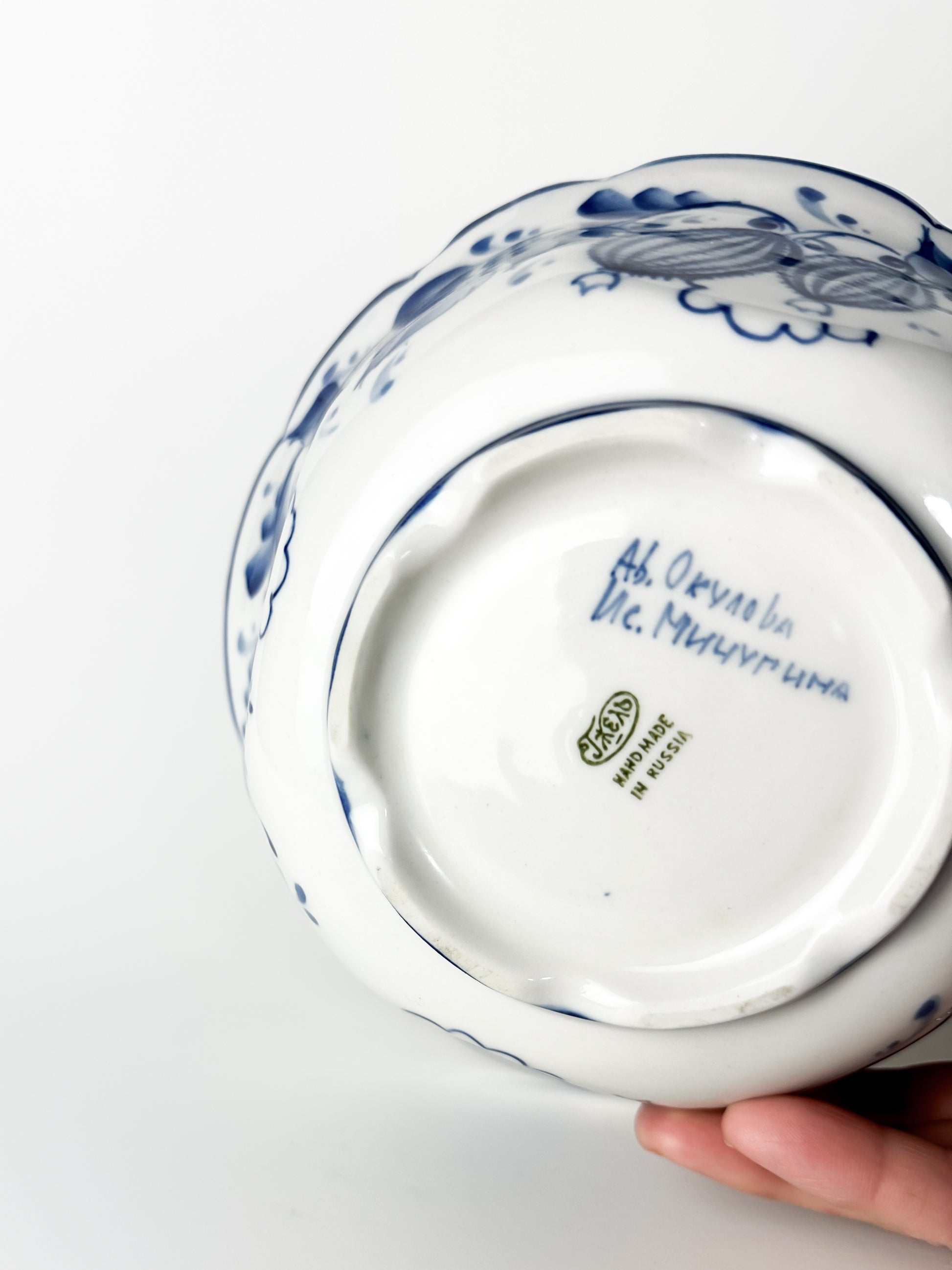 This exquisite hand-painted ceramic bowl, marked “Handmade in Russia” and signed in Cyrillic script, carries the spirit of traditional Russian artistry. Its delicate blue-on-white floral motif recalls the centuries-old craft of Gzhel pottery — a style that originated near Moscow in the early 19th century and became world-renowned for its luminous cobalt designs. Each brushstroke in these pieces was applied by hand, creating subtle variations that made every vessel unique — no two ever truly alike.