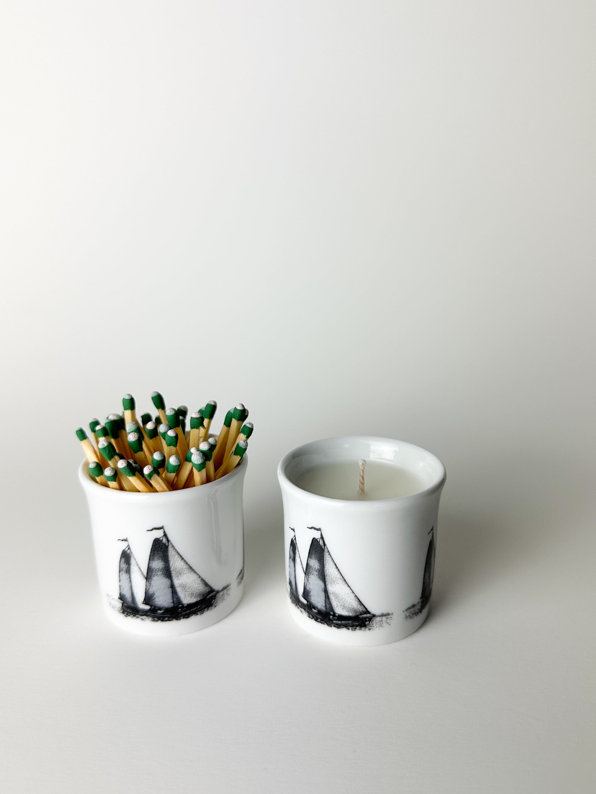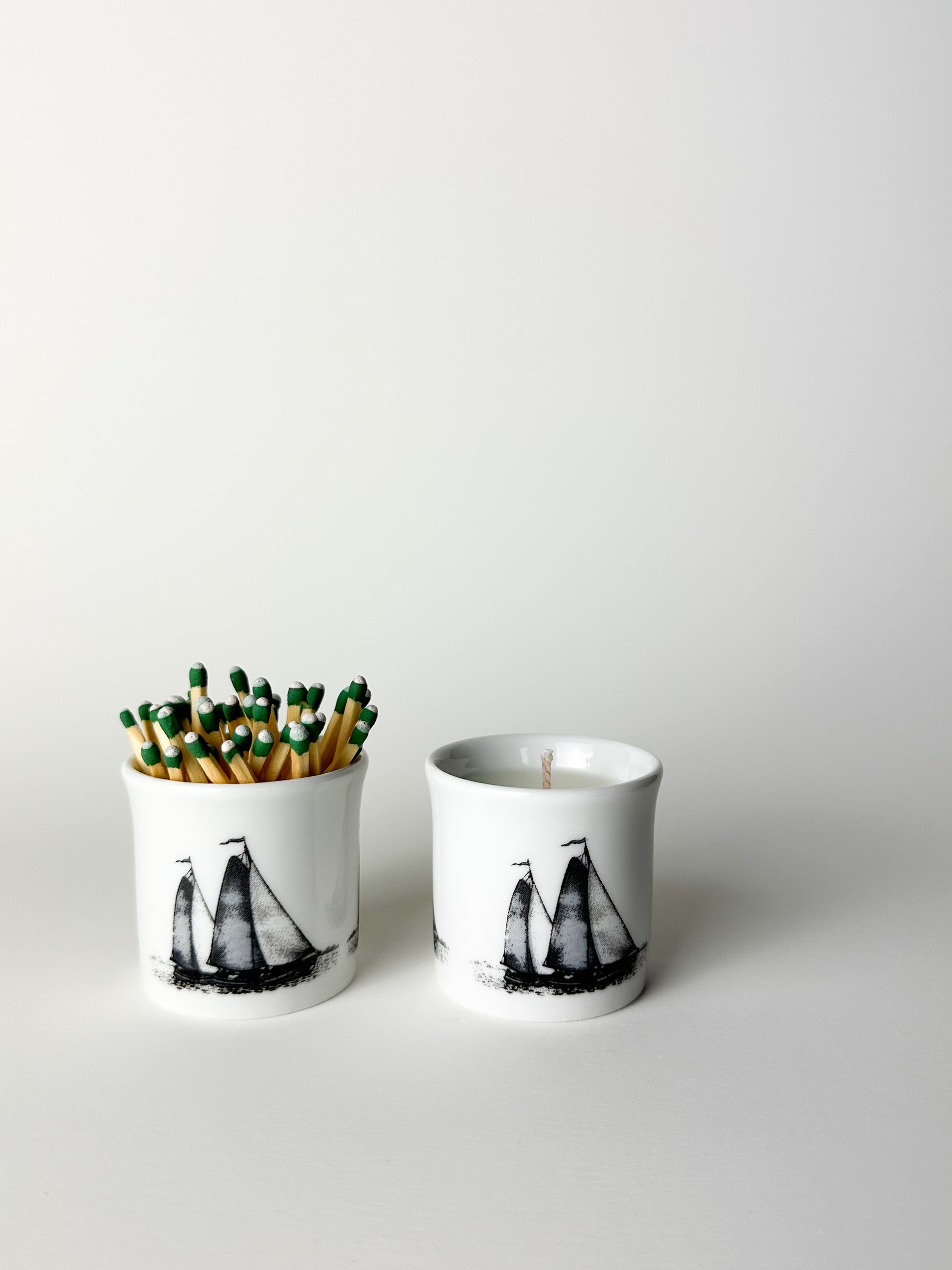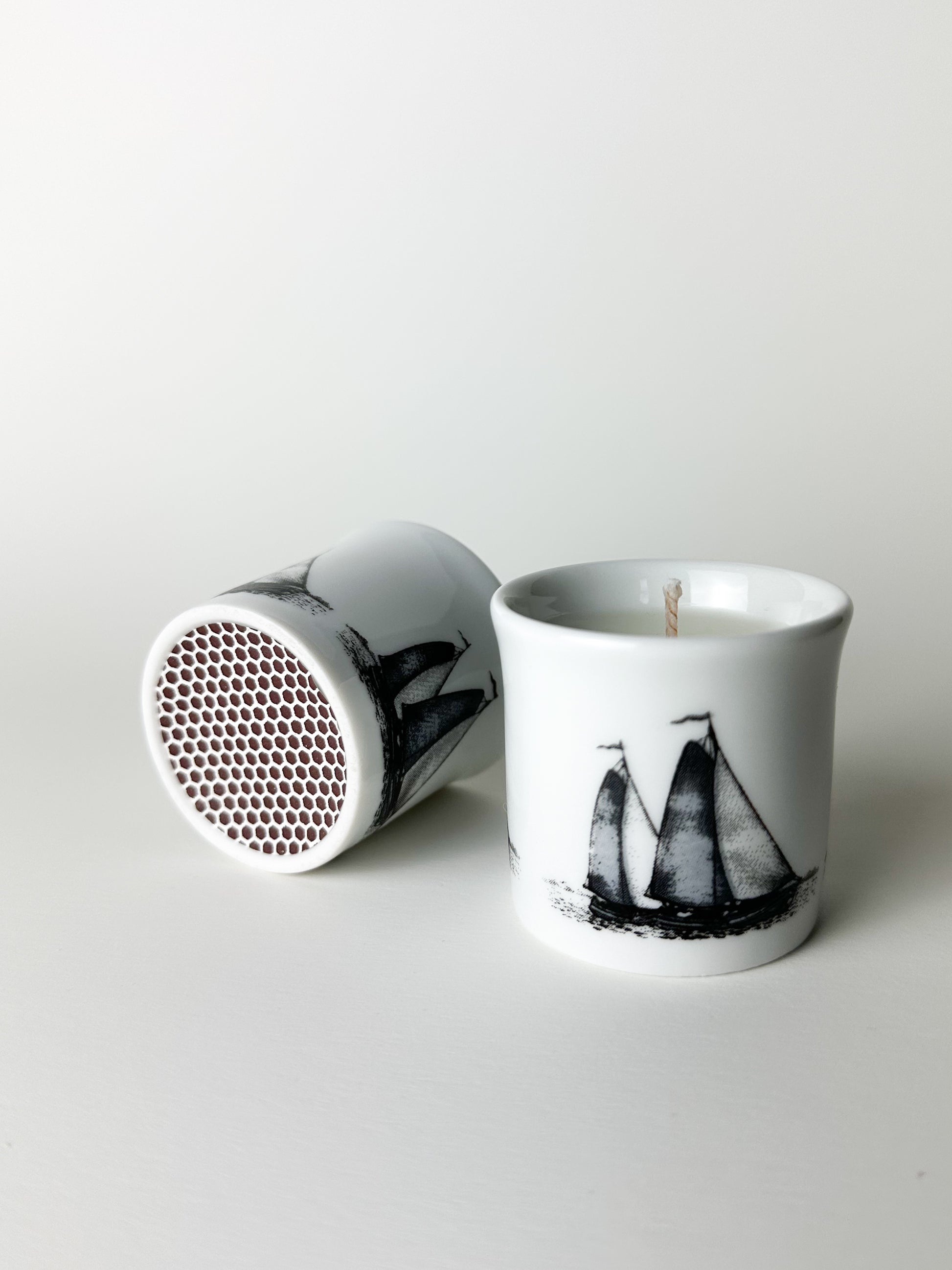 Each vessel has been given a second life—one as a delicate candle and the other as a match holder, complete with a strike pad affixed to the base. The two pieces together create a timeless pairing: light and flame, old and new.