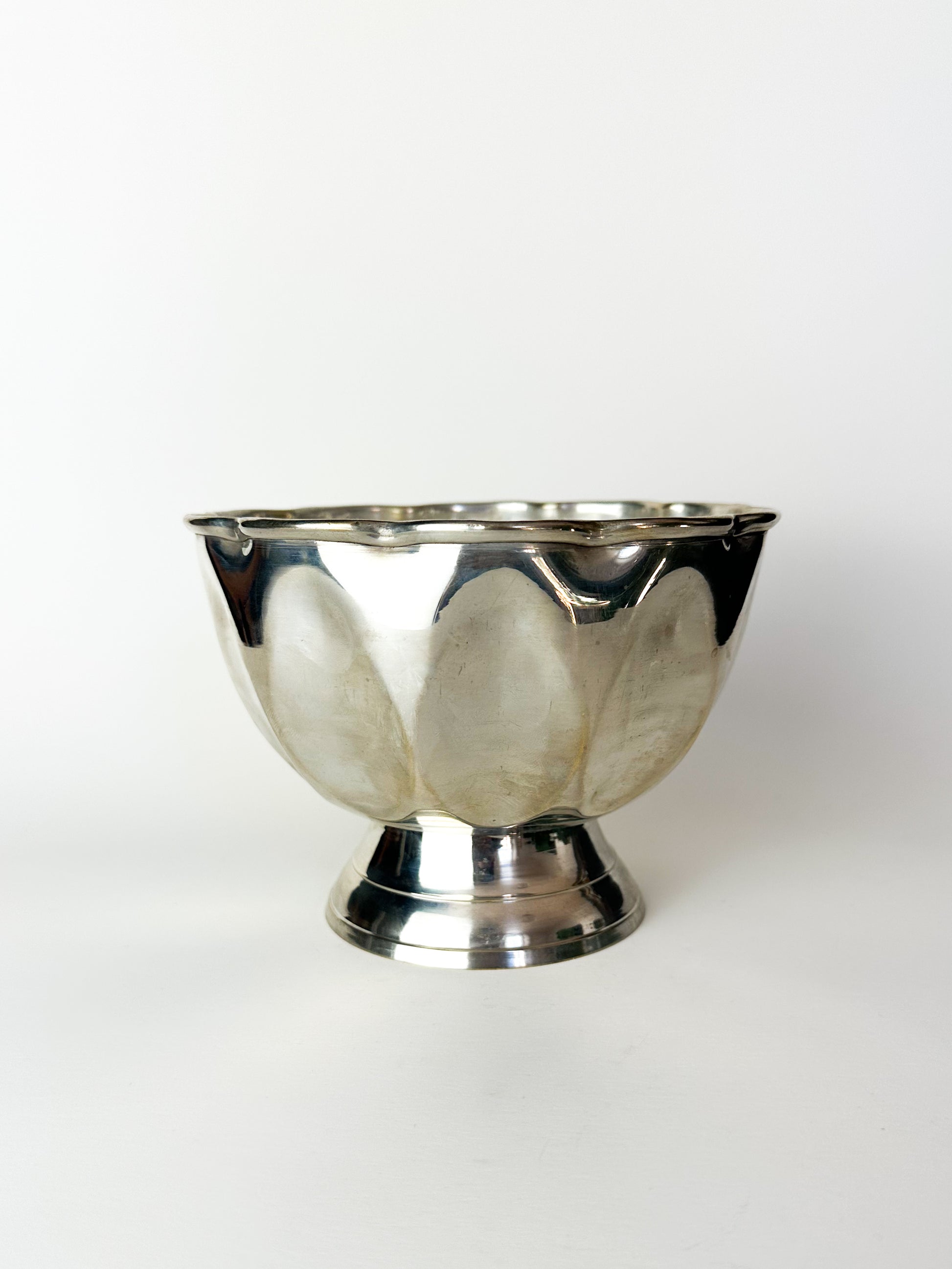 This vintage silver footed bowl features a softly scalloped rim and classic pedestal base, a form commonly found in early 20th-century tableware. Pieces like this were designed to elevate everyday dining and entertaining, reflecting candlelight and adding quiet elegance to formal and informal settings alike.